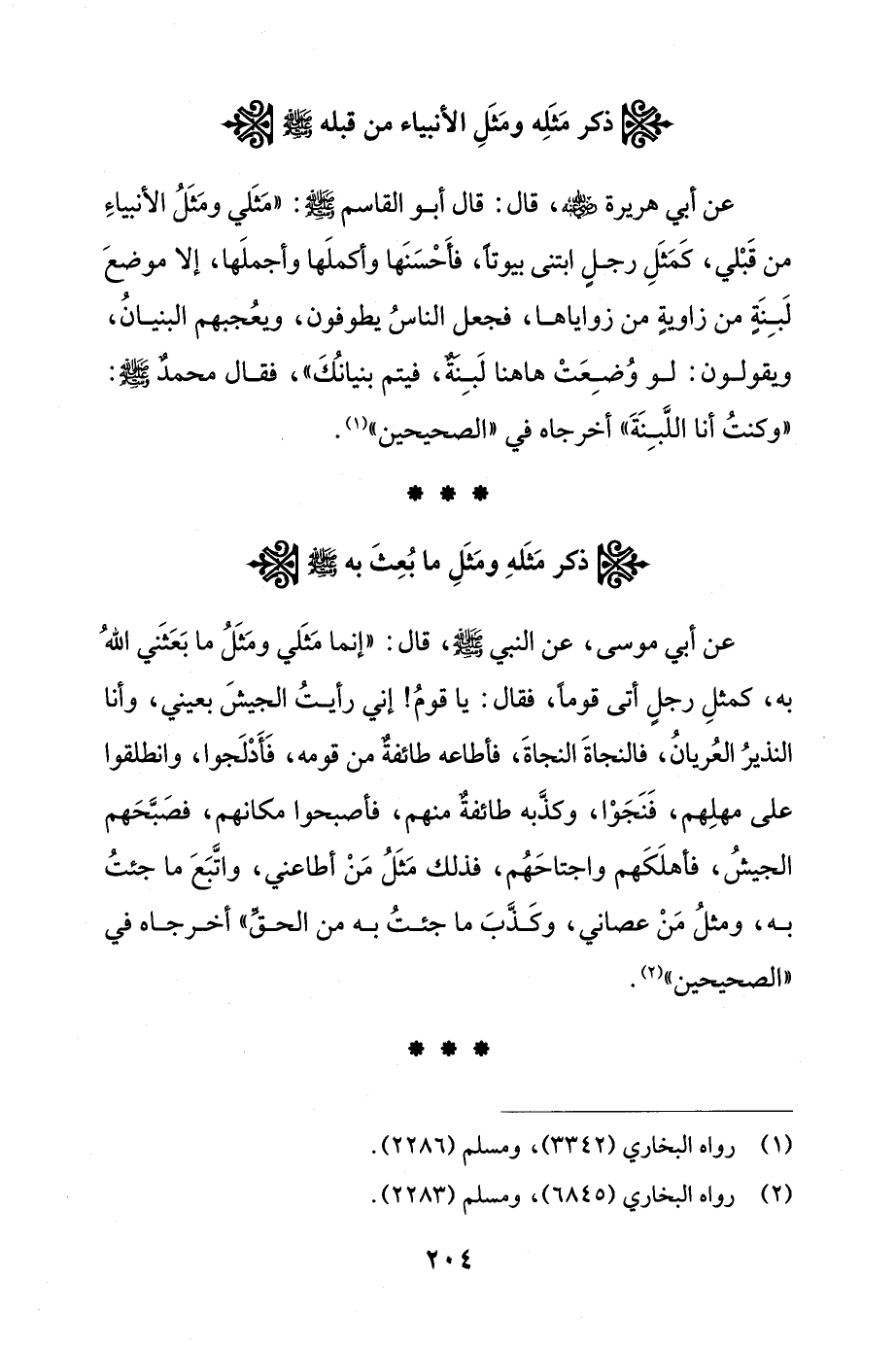 عن أبي هريرة - رضي الله عنه -، قال: قال أبو القاسم - صلى الله عليه وسلم -: "مَثَلي ومَثَلُ الأنبياءِ من قَبْلي، كَمَثَلِ رجلٍ ابتنى بيوتًا، فأَحْسَنَها وأكملَها وأجملَها، إلا موضعَ لَبِنَةٍ من زاويةٍ من زواياها، فجعل الناسُ يطوفون، ويعُجبهم البنيان، ويقولون: لو وُضِعَتْ هاهنا لَبِنَةٌ، فيتم بنيانُكَ"، فقال محمدٌ - صلى الله عليه وسلم -: "وكنتُ أنا اللَّبِنَةَ" أخرجاه في "الصحيحين" (¬1).