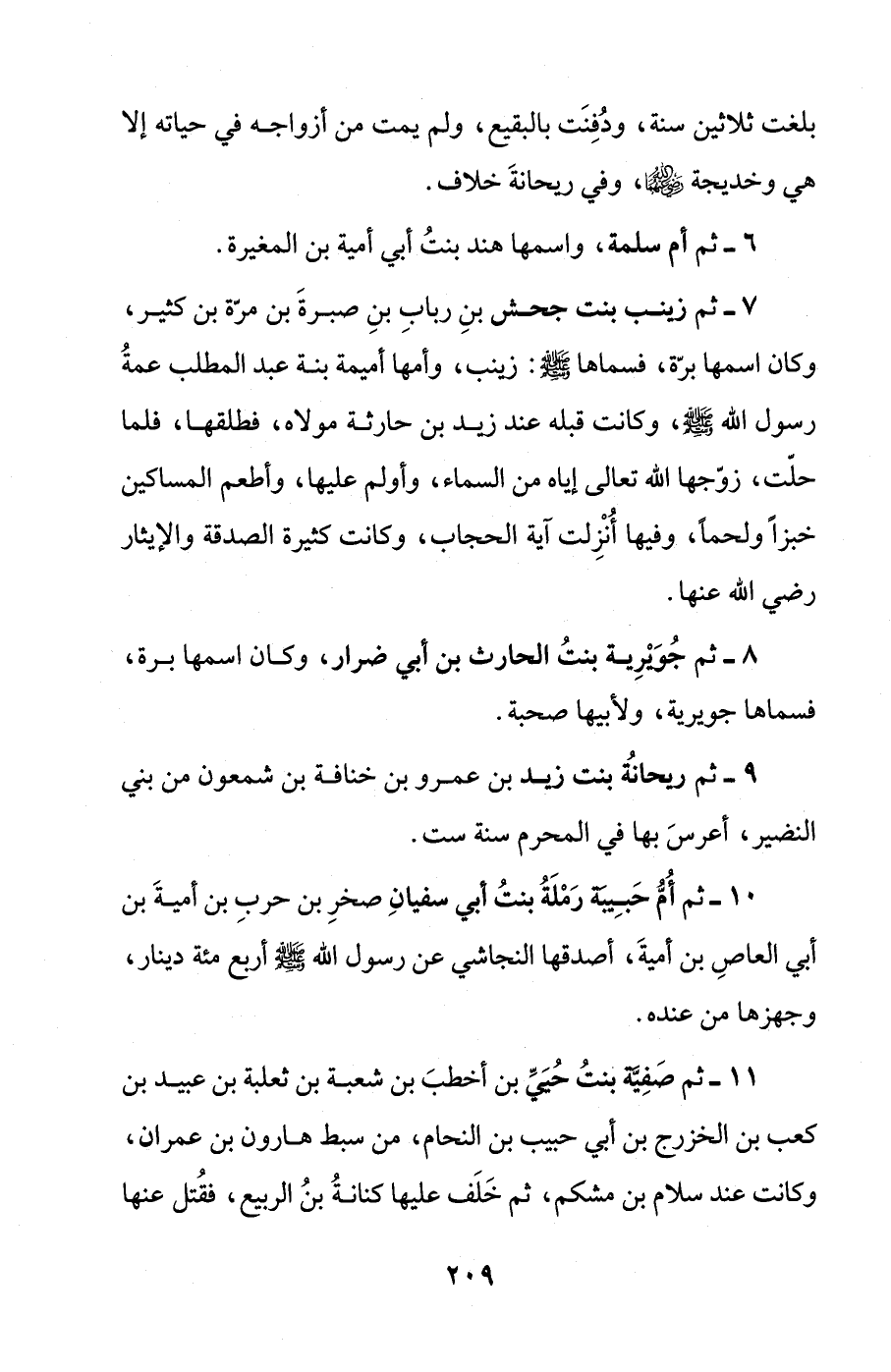 9 - ثم ريحانُة بنت زيد بن عمرو بن خنافة بن شمعون من بني النضير، أعرسَ بها في المحرم سنة ست.