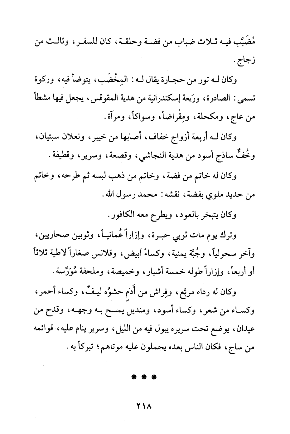 وكان له رداء مربَّع، وفِراش من أَدَمٍ حشوُه ليفٌ، وكساء أحمر، وكساء من شعر، وكساء أسود، ومنديل يمسح به وجهه، وقدح من عيدان، يوضع تحت سريره يبول فيه من الليل، وسرير ينام عليه، قوائمه من ساج، فكان الناس بعده يحملون عليه موتاهم؛ تبركًا به.
