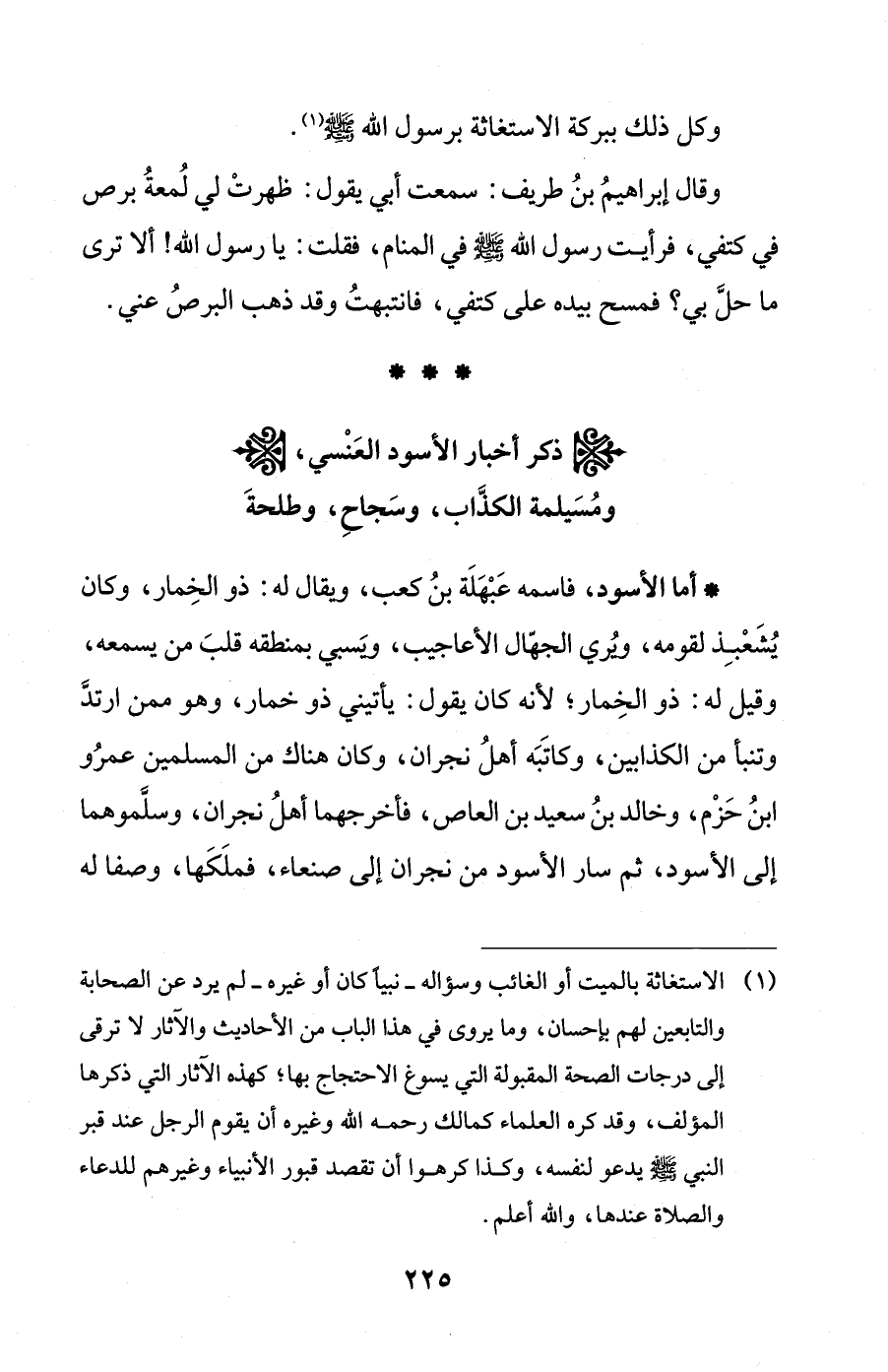 (¬1) الاستغاثة بالميت أو الغائب وسؤاله - نبيًا كان أو غيره - لم يرد عن الصحابة والتابعين لهم بإحسان، وما يروى في هذا الباب من الأحاديث والآثار لا ترقى إلى درجات الصحة المقبولة التي يسوغ الاحتجاج بها؛ كهذه الآثار التي ذكرها المؤلف، وقد كره العلماء كمالك رحمه الله وغيره أن يقوم الرجل عند قبر النبي - صلى الله عليه وسلم - يدعو لنفسه، وكذا كرهوا أن تقصد قبور الأنبياء وغيرهم للدعاء والصلاة عندها، والله أعلم.
