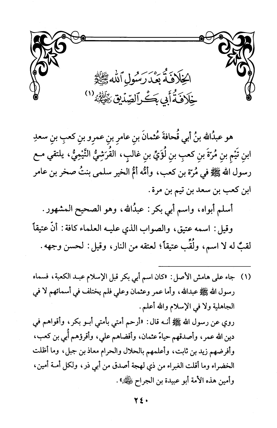 (¬1) جاء على هامش الأصل: "كان اسم أبي بكر قبل الإسلام عبد الكعبة، فسماه رسول الله - صلى الله عليه وسلم - عبد الله، وأما عمر وعثمان وعلي فلم يختلف في أسمائهم لا في الجاهلية ولا في الإسلام والله أعلم.