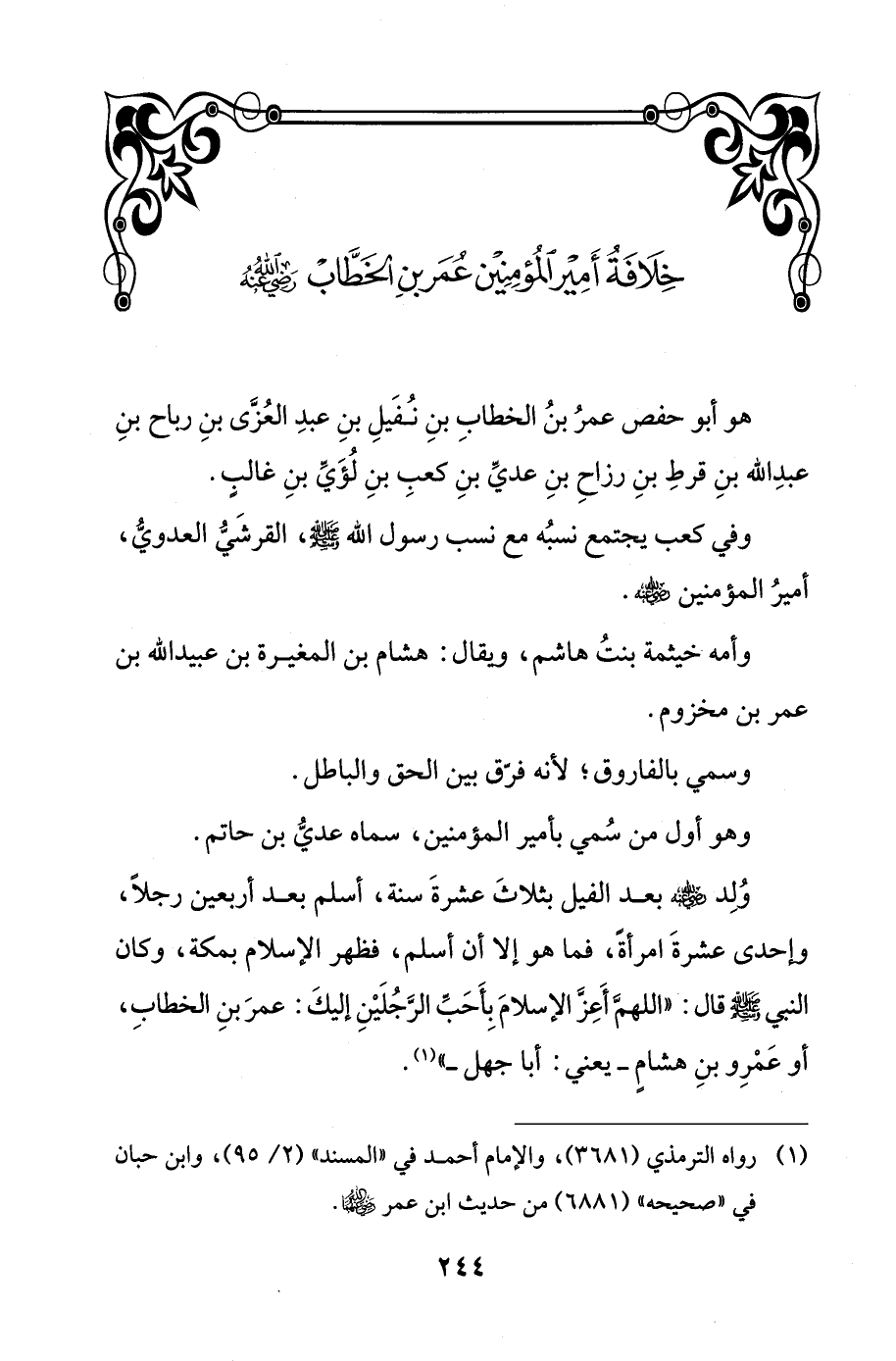وُلِد - رضي الله عنه - بعد الفيل بثلاثَ عشرةَ سنة، أسلم بعد أربعين رجلًا، وإحدى عشرةَ امرأةً، فما هو إلا أن أسلم، فظهر الإسلام بمكة، وكان النبي - صلى الله عليه وسلم - قال: "اللهمَّ أَعِزَّ الإسلامَ بِأحَبِّ الرَّجُلَيْنِ إليكَ: عمرَ بنِ الخطابِ، أو عَمْرِو بنِ هشامٍ - يعني: أبا جهل - " (¬1).