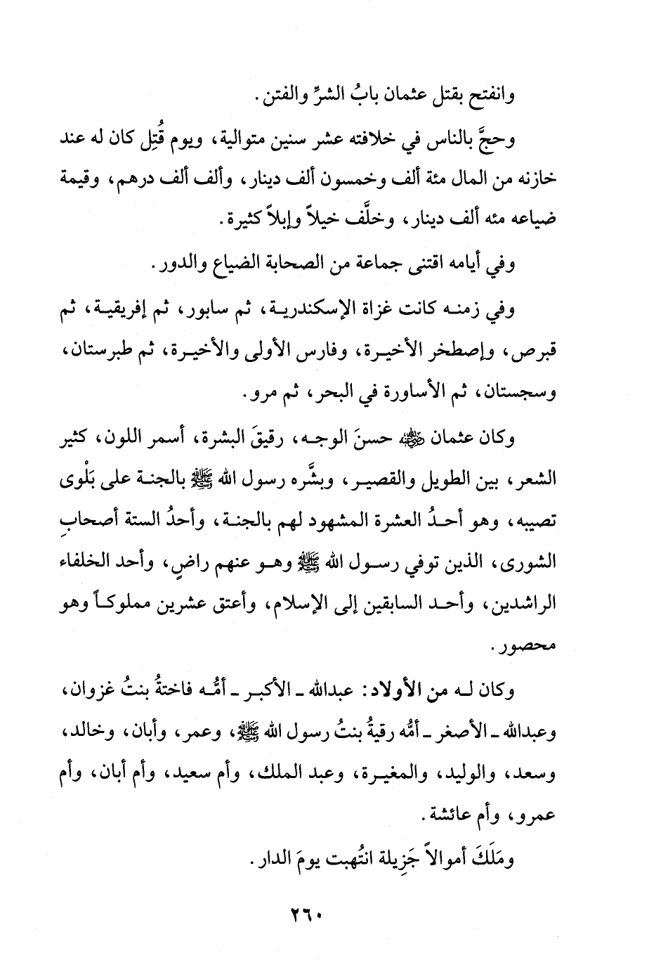 وكان عثمان - رضي الله عنه - حسنَ الوجه، رقيقَ البشرة، أسمر اللون، كثير الشعر، بين الطويل والقصير، وبشَّره رسول الله - صلى الله عليه وسلم - بالجنة على بَلْوى تصيبه، وهو أحدُ العشرة المشهود لهم بالجنة، وأحدُ الستة أصحابِ الشورى، الذين توفي رسول الله - صلى الله عليه وسلم - وهو عنهم راضٍ، وأحد الخلفاء الراشدين، وأحد السابقين إلى الإسلام، وأعتق عشرين مملوكًا وهو محصور.