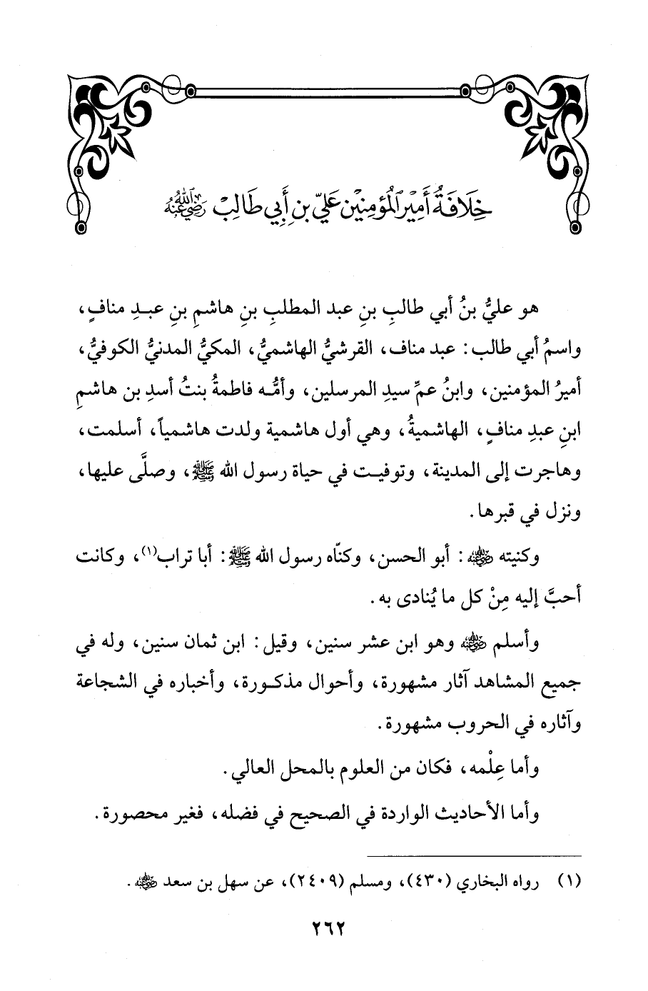 هو عليُّ بنُ أبي طالبِ بنِ عبد المطلبِ بنِ هاشمِ بنِ عبدِ منافٍ، واسمُ أبي طالب: عبد مناف، القرشيُّ الهاشميُّ، المكيُّ المدنيُّ الكوفيُّ، أميرُ المؤمنين، وابنُ عمِّ سيدِ المرسلين، وأمُّه فاطمةُ بنتُ أسدِ بن هاشمِ ابنِ عبدِ منافٍ، الهاشميةُ، وهي أول هاشمية ولدت هاشميًا، أسلمت، وهاجرت إلى المدينة، وتوفيت في حياة رسول الله - صلى الله عليه وسلم -، وصلَّى عليها، ونزل في قبرها.