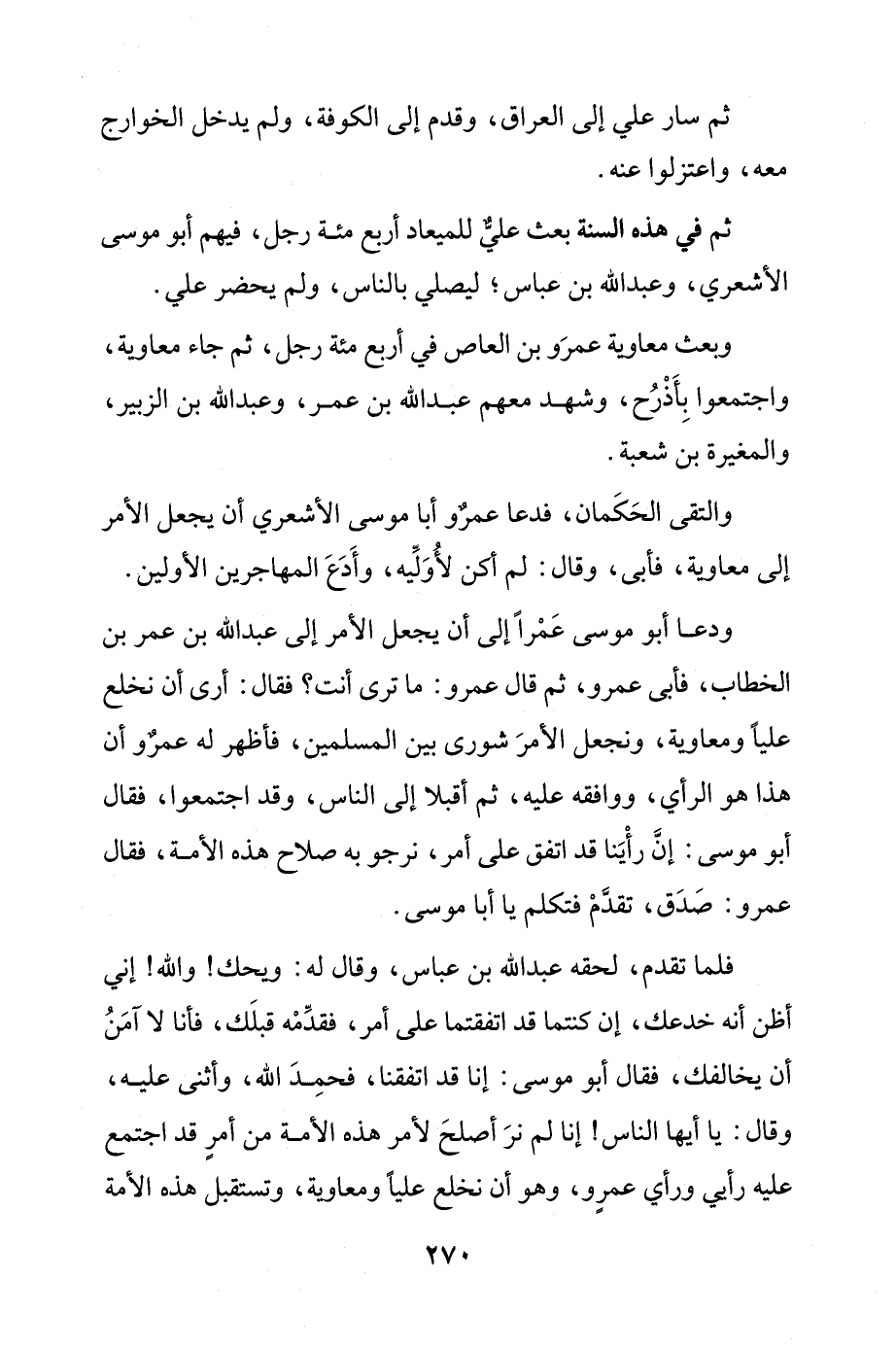 ودعا أبو موسى عَمْرًا إلى أن يجعل الأمر إلى عبد الله بن عمر بن الخطاب، فأبى عمرو، ثم قال عمرو: ما ترى أنت؟ فقال: أرى أن نخلع عليًا ومعاوية، ونجعل الأمرَ شورى بين المسلمين، فأظهر له عمرٌو أن هذا هو الرأي، ووافقه عليه، ثم أقبلا إلى الناس، وقد اجتمعوا، فقال أبو موسى: إنَّ رأْيَنا قد اتفق على أمر، نرجو به صلاح هذه الأمة، فقال عمرو: صَدَق، تقدَّمْ فتكلم يا أبا موسى.