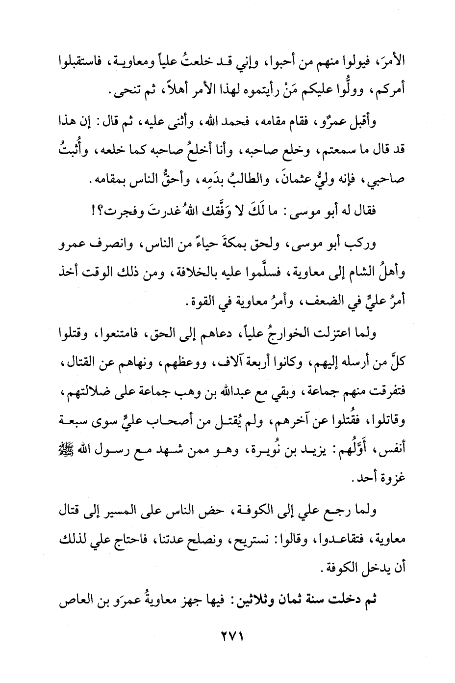 وأقبل عمرٌو، فقام مقامه، فحمد الله، وأثنى عليه، ثم قال: إن هذا قد قال ما سمعتم، وخلع صاحبه، وأنا أخلعُ صاحبه كما خلعه، وأُثبتُ صاحبي، فإنه وليُّ عثمانَ، والطالبُ بدَمِه، وأحقُّ الناس بمقامه.