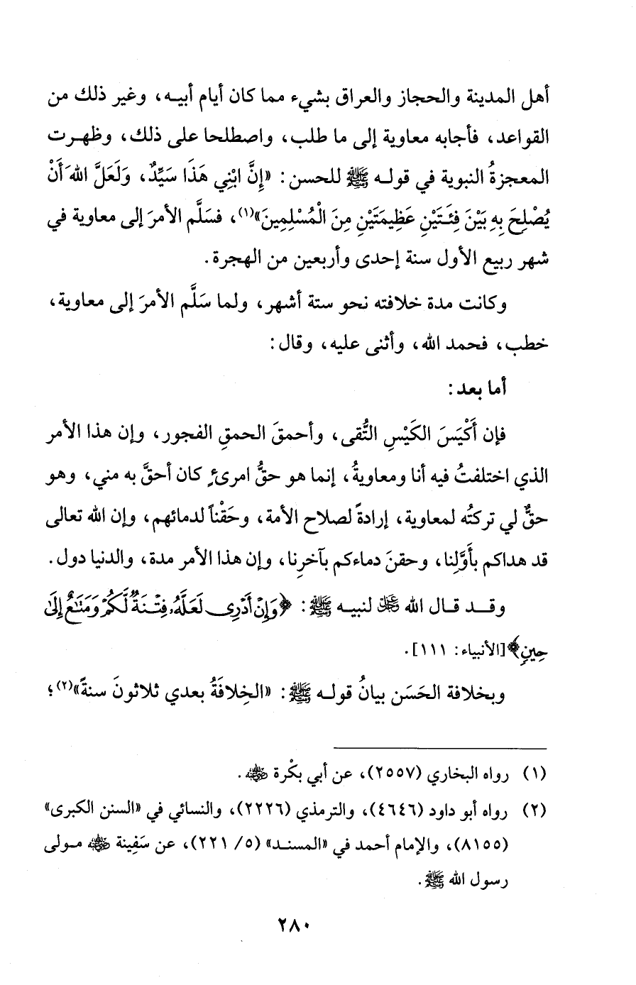 أهل المدينة والحجاز والعراق بشيء مما كان أيام أبيه، وغير ذلك من القواعد، فأجابه معاوية إلى ما طلب، واصطلحا على ذلك، وظهرت المعجزةُ النبوية في قوله - صلى الله عليه وسلم - للحسن: "إِنَّ ابْنِي هَذَا سَيِّدٌ، وَلَعَلَّ اللهَ أَنْ يُصْلِحَ بِهِ بَيْنَ فِئَتَيْنِ عَظِيمَتَيْنِ مِنَ الْمُسْلِمِينَ" (¬1)، فسَلَّم الأمرَ إلى معاوية في شهر ربيع الأول سنة إحدى وأربعين من الهجرة.