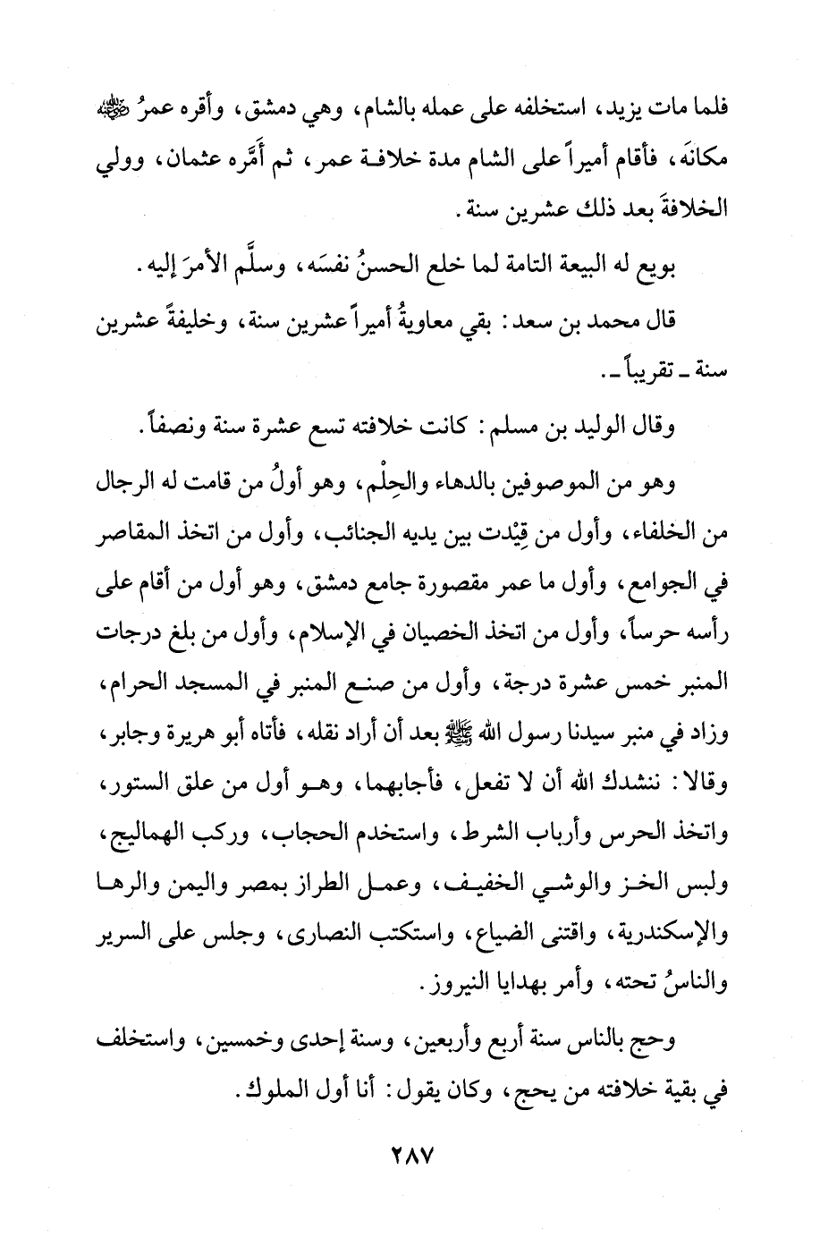 وهو من الموصوفين بالدهاء والحِلْم، وهو أولُ من قامت له الرجال من الخلفاء، وأول من قِيْدت بين يديه الجنائب، وأول من اتخذ المقاصر في الجوامع، وأول ما عمر مقصورة جامع دمشق، وهو أول من أقام على رأسه حرسًا، وأول من اتخذ الخصيان في الإسلام، وأول من بلغ درجات المنبر خمس عشرة درجة، وأول من صنع المنبر في المسجد الحرام، وزاد في منبر سيدنا رسول الله - صلى الله عليه وسلم - بعد أن أراد نقله، فأتاه أبو هريرة وجابر، وقالا: ننشدك الله أن لا تفعل، فأجابهما، وهو أول من علق الستور، واتخذ الحرس وأرباب الشرط، واستخدم الحجاب، وركب الهماليج، ولبس الخز والوشي الخفيف، وعمل الطراز بمصر واليمن والرها والإسكندرية، واقتنى الضياع، واستكتب النصارى، وجلس على السرير والناسُ تحته، وأمر بهدايا النيروز.