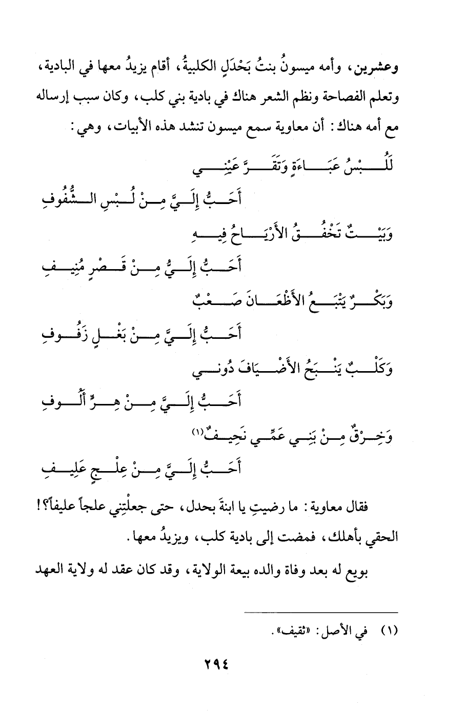 فقال معاوية: ما رضيتِ يا ابنةَ بحدل، حتى جعلْتِني علجًا عليفًا؟ ! الحقي بأهلك، فمضت إلى بادية كلب، ويزيدُ معها.