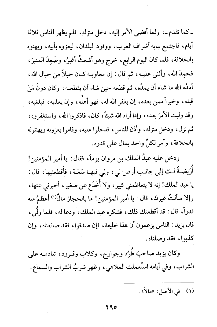 ودخل عليه عبدُ الملك بن مروان يومًا، فقال: يا أمير المؤمنين! أُرَيضةٌ لك إلى جانب أرض لي، ولي فيها سَعَة، فأَقطعنيها، قال: يا عبد الملك! إنه لا يتعاظمني كبير، ولا أُخْدَع عن صغير، أخبرني عنها، وإلا سألتُ غيرك، قال: يا أمير المؤمنين! ما بالحجاز مالٌ (¬1) أعظمُ منه قدرًا، قال: قد أقطعتك ذلك، فشكره عبد الملك، ودعا له، فلما ولَّى، قال يزيد: الناس يزعمون أن هذا خليفة، فإن صدقوا، فقد صانعناه، وإن كذبوا، فقد وصلناه.
