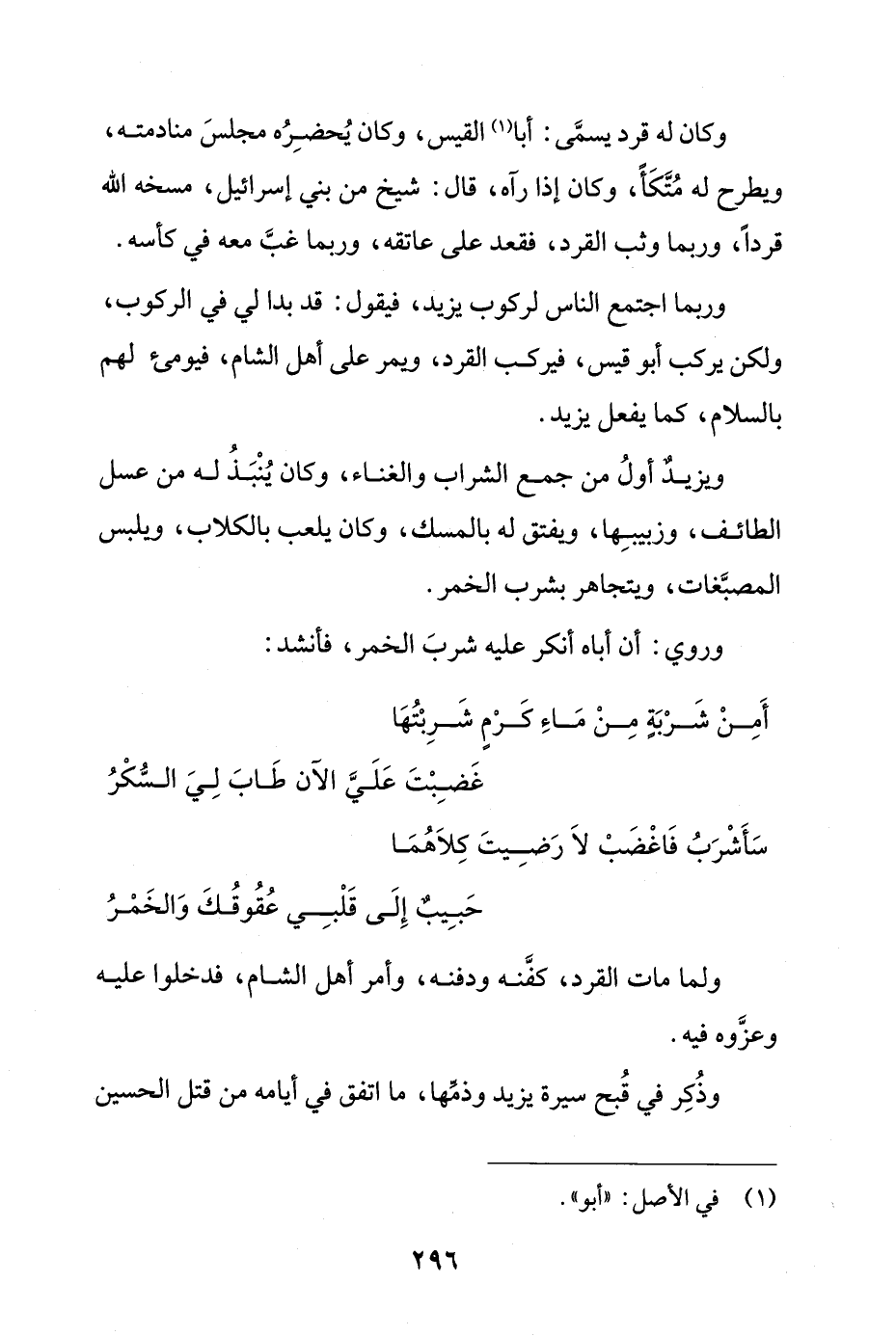 ويزيدٌ أولُ من جمع الشراب والغناء، وكان يُنْبَذُ له من عسل الطائف، وزبيبِها، ويفتق له بالمسك، وكان يلعب بالكلاب، ويلبس المصبَّغات، ويتجاهر بشرب الخمر.