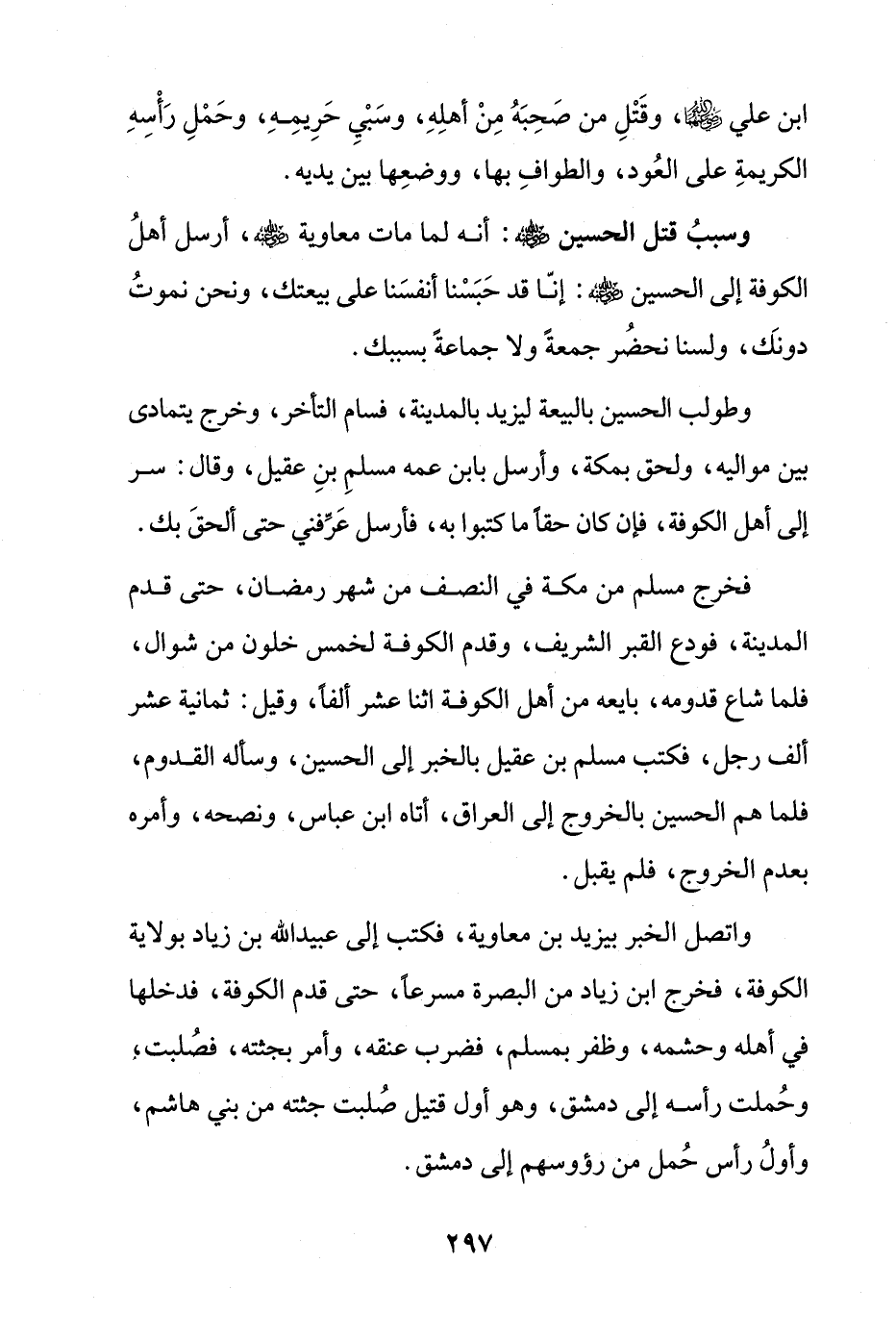 ابن علي - رضي الله عنهما -، وقَتْلِ من صَحِبَهُ مِنْ أهلِهِ، وسَبْيِ حَرِيمِهِ، وحَمْلِ رَأْسِهِ الكريمةِ على العُود، والطوافِ بها، ووضعِها بين يديه.