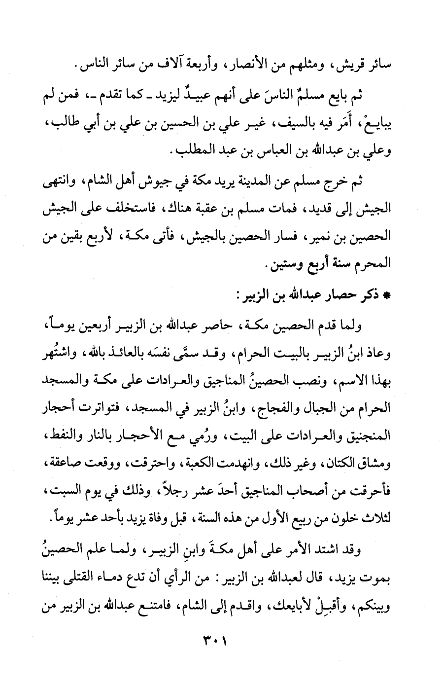 ولما قدم الحصين مكة، حاصر عبد الله بن الزبير أربعين يومًا، وعاذ ابنُ الزبير بالبيت الحرام، وقد سمَّى نفسَه بالعائذ بالله، واشتُهر بهذا الاسم، ونصب الحصينُ المناجيق والعرادات على مكة والمسجد الحرام من الجبال والفجاج، وابنُ الزبير في المسجد، فتواترت أحجار المنجنيق والعرادات على البيت، ورُمي مع الأحجار بالنار والنفط، ومشاق الكتان، وغير ذلك، وانهدمت الكعبة، واحترقت، ووقعت صاعقة، فأحرقت من أصحاب المجانيق أحدَ عشر رجلًا، وذلك في يوم السبت، لثلاث خلون من ربيع الأول من هذه السنة، قبل وفاة يزيد بأحد عشر يومًا.