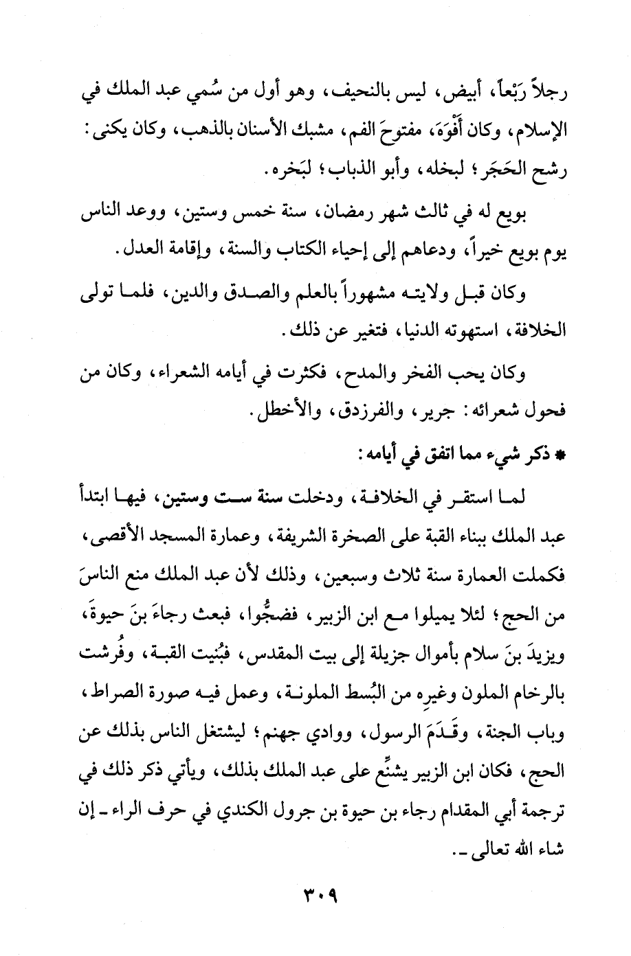 لما استقر في الخلافة، ودخلت سنة ست وستين، فيها ابتدأ عبد الملك ببناء القبة على الصخرة الشريفة، وعمارة المسجد الأقصى، فكملت العمارة سنة ثلاث وسبعين، وذلك لأن عبد الملك منع الناسَ من الحج؛ لئلا يميلوا مع ابن الزبير، فضجُّوا، فبعث رجاءَ بنَ حيوةَ، ويزيدَ بنَ سلام بأموال جزيلة إلى بيت المقدس، فبُنيت القبة، وفُرشت بالرخام الملون وغيرِه من البُسط الملونة، وعمل فيه صورة الصراط، وباب الجنة، وقَدَمَ الرسول، ووادي جهنم؛ ليشتغل الناس بذلك عن الحج، فكان ابن الزبير يشنِّع على عبد الملك بذلك، ويأتي ذكر ذلك في ترجمة أبي المقدام رجاء بن حيوة بن جرول الكندي في حرف الراء - إن شاء الله تعالى -.