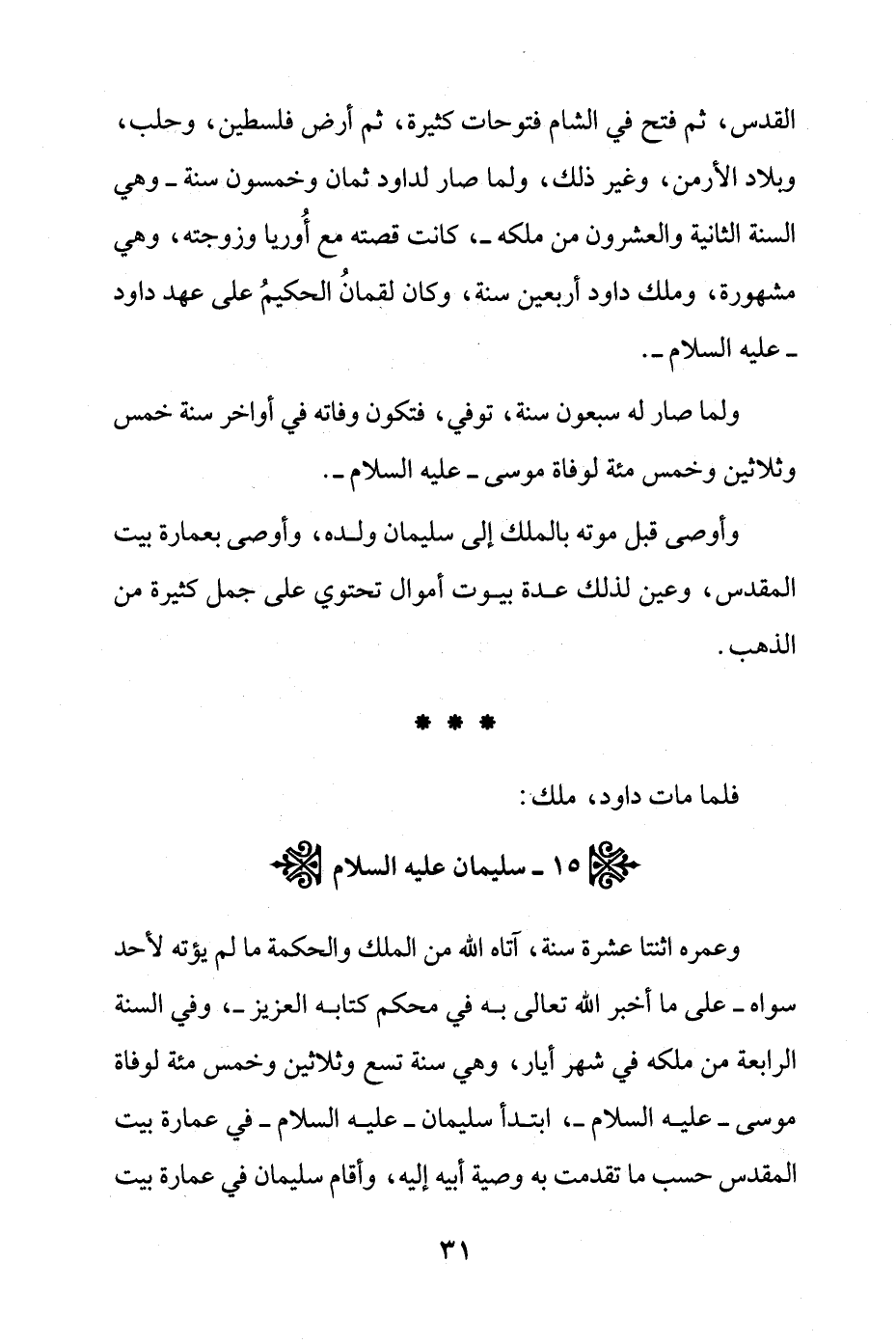 القدس، ثم فتح في الشام فتوحات كثيرة، ثم أرض فلسطين، وحلب، وبلاد الأرمن، وغير ذلك، ولما صار لداود ثمان وخمسون سنة - وهي السنة الثانية والعشرون من ملكه -، كانت قصته مع أُوريا وزوجته، وهي مشهورة، وملك داود أربعين سنة، وكان لقمانُ الحكيمُ على عهد داود - عليه السلام -.