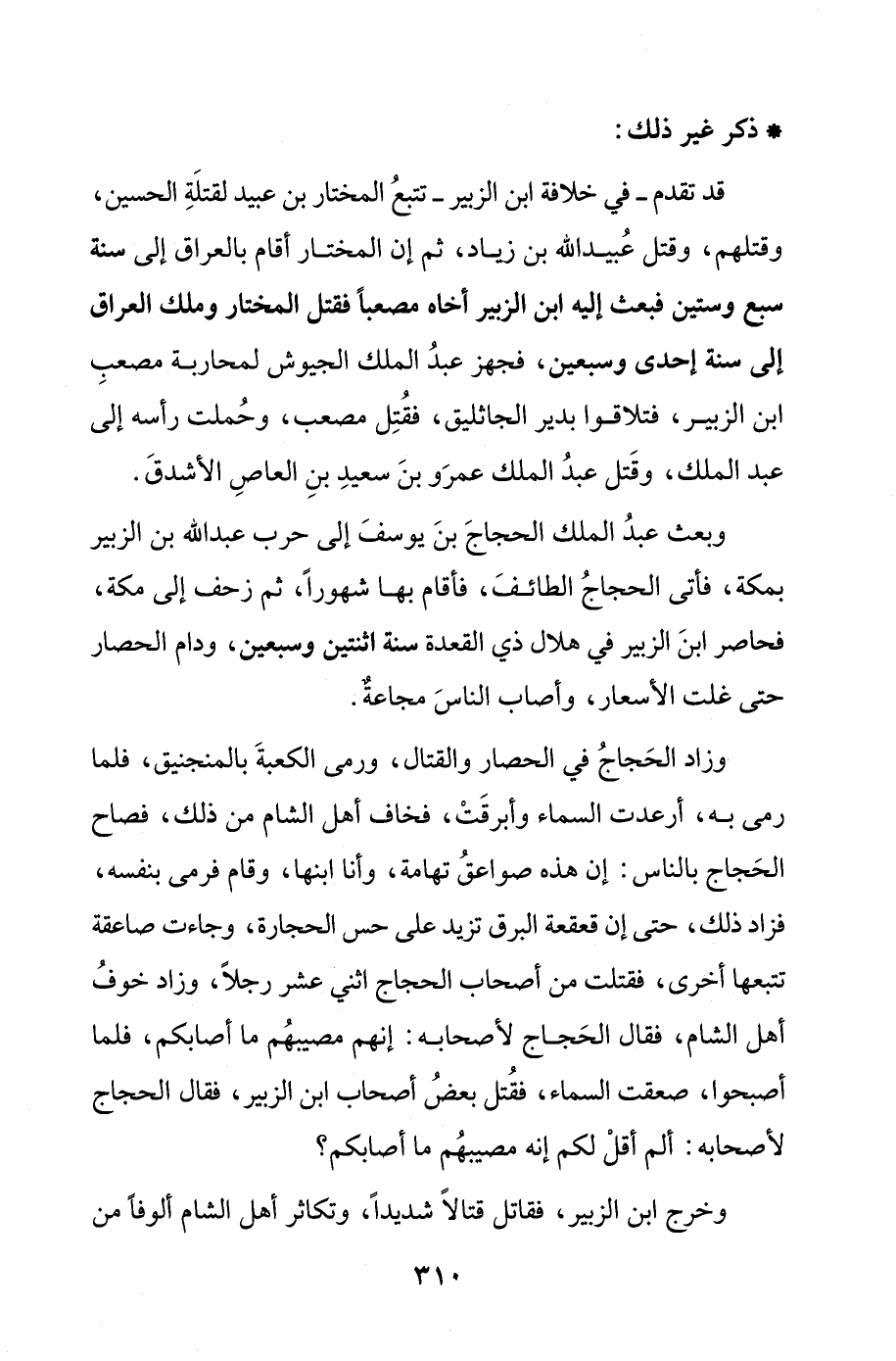 قد تقدم - في خلافة ابن الزبير - تتبعُ المختار بن عبيد لقتلَةِ الحسين، وقتلهم، وقتل عُبيد الله بن زياد، ثم إن المختار أقام بالعراق إلى سنة سبع وستين فبعث إليه ابن الزبير أخاه مصعبًا فقتل المختار وملك العراق إلى سنة إحدى وسبعين، فجهز عبدُ الملك الجيوش لمحاربة مصعبِ ابن الزبير، فتلاقوا بدير الجاثليق، فقُتِل مصعب، وحُملت رأسه إلى عبد الملك، وقَتل عبدُ الملك عمرَو بنَ سعيدِ بنِ العاصِ الأشدقَ.