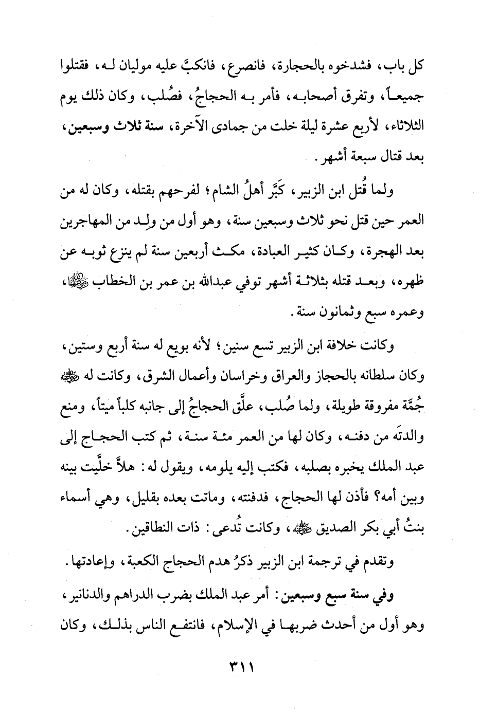 وكانت خلافة ابن الزبير تسع سنين؛ لأنه بويع له سنة أربع وستين، وكان سلطانه بالحجاز والعراق وخراسان وأعمال الشرق، وكانت له - رضي الله عنه - جُمَّة مفروقة طويلة، ولما صُلب، علَّق الحجاجُ إلى جانبه كلبًا ميتًا، ومنع والدتَه من دفنه، وكان لها من العمر مئة سنة، ثم كتب الحجاج إلى عبد الملك يخبره بصلبه، فكتب إليه يلومه، ويقول له: هلَّا خلَّيت بينه وبين أمه؟ فأذن لها الحجاج، فدفنته، وماتت بعده بقليل، وهي أسماء بنتُ أبي بكر الصديق - رضي الله عنه -، وكانت تُدعى: ذات النطاقين.
