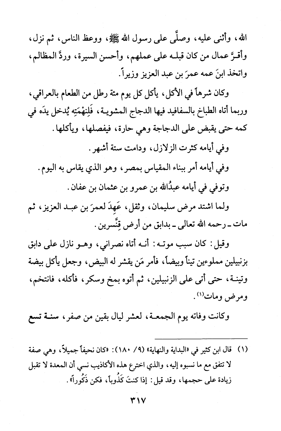 ولما اشتد مرض سليمان، وثقل، عَهِدَ لعمرَ بن عبد العزيز، ثم مات - رحمه الله تعالى - بدابق من أرض قِنَّسرين.