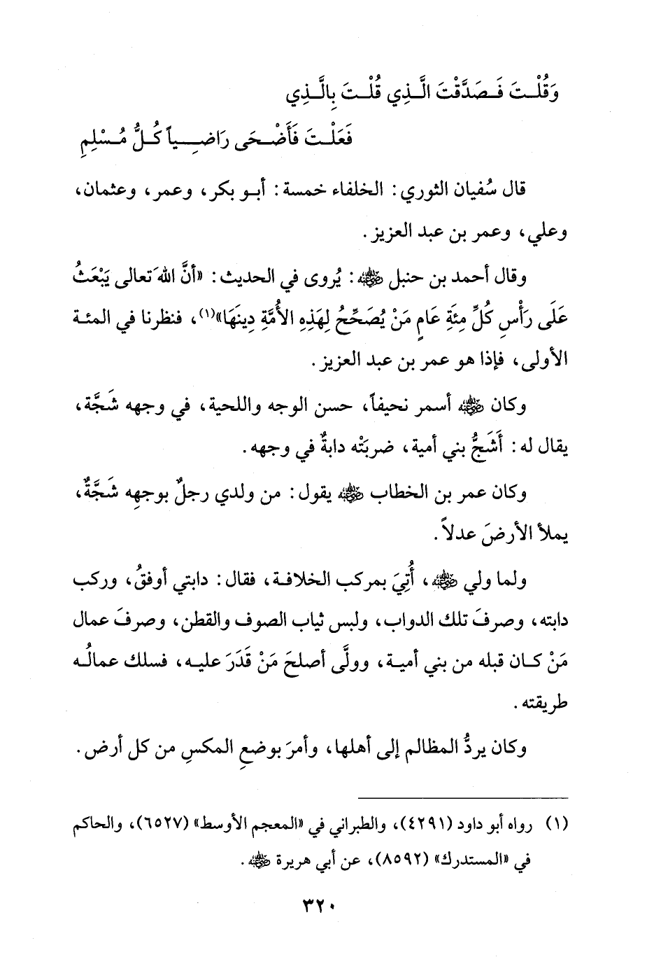 وقال أحمد بن حنبل - رضي الله عنه -: يُروى في الحديث: "أنَّ اللهَ تعالى يَبْعَثُ عَلَى رَأْسِ كُلِّ مِئَةِ عَامٍ مَنْ يُصَحِّحُ لِهَذهِ الأُمَّةِ دِينَهَا" (¬1)، فنظرنا في المئة الأولى، فإذا هو عمر بن عبد العزيز.