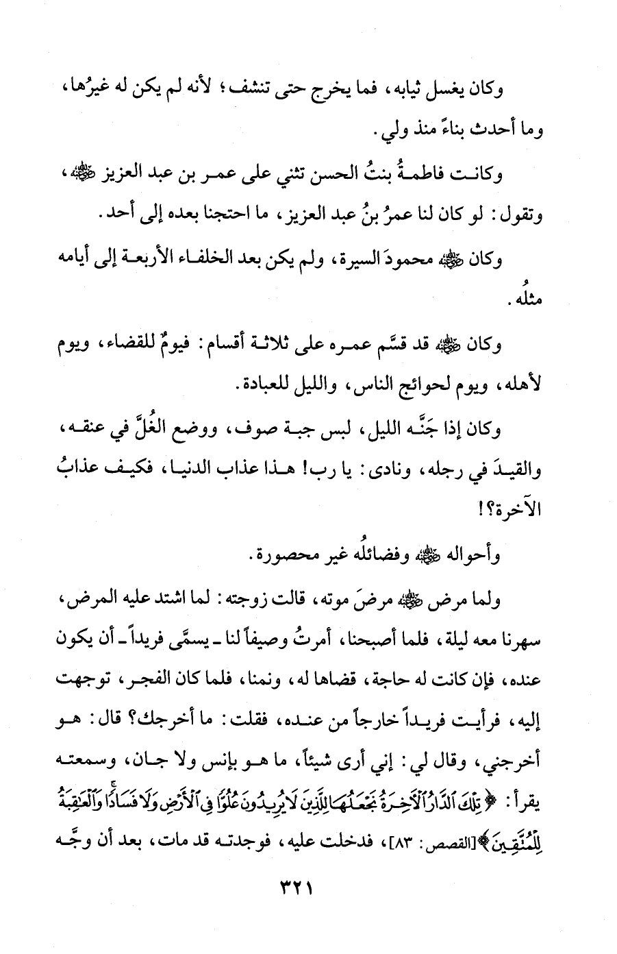 وكانت فاطمةُ بنتُ الحسن تثني على عمر بن عبد العزيز - رضي الله عنه -، وتقول: لو كان لنا عمرُ بنُ عبد العزيز، ما احتجنا بعده إلى أحد.