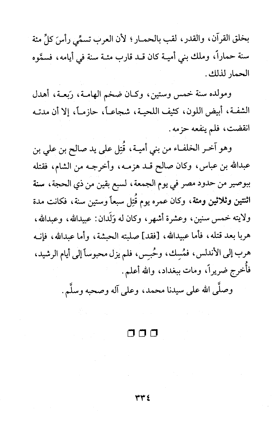 بخلق القرآن، والقدر، لقب بالحمار؛ لأن العرب تسمِّي رأسَ كلِّ مئة سنة حمارًا، وملك بني أمية كان قد قارب مئة سنة في أيامه، فسمَّوه الحمار لذلك.