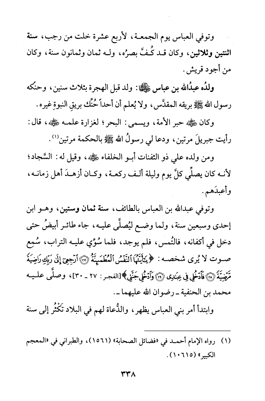 ولدُه عبدُ الله بن عباس - رضي الله عنهما -: ولد قبل الهجرة بثلاث سنين، وحنّكه رسول الله - صلى الله عليه وسلم - بريقه المقدَّس، ولا يُعلم أن أحدًا حُنِّك بريقِ النبوةِ غيره.