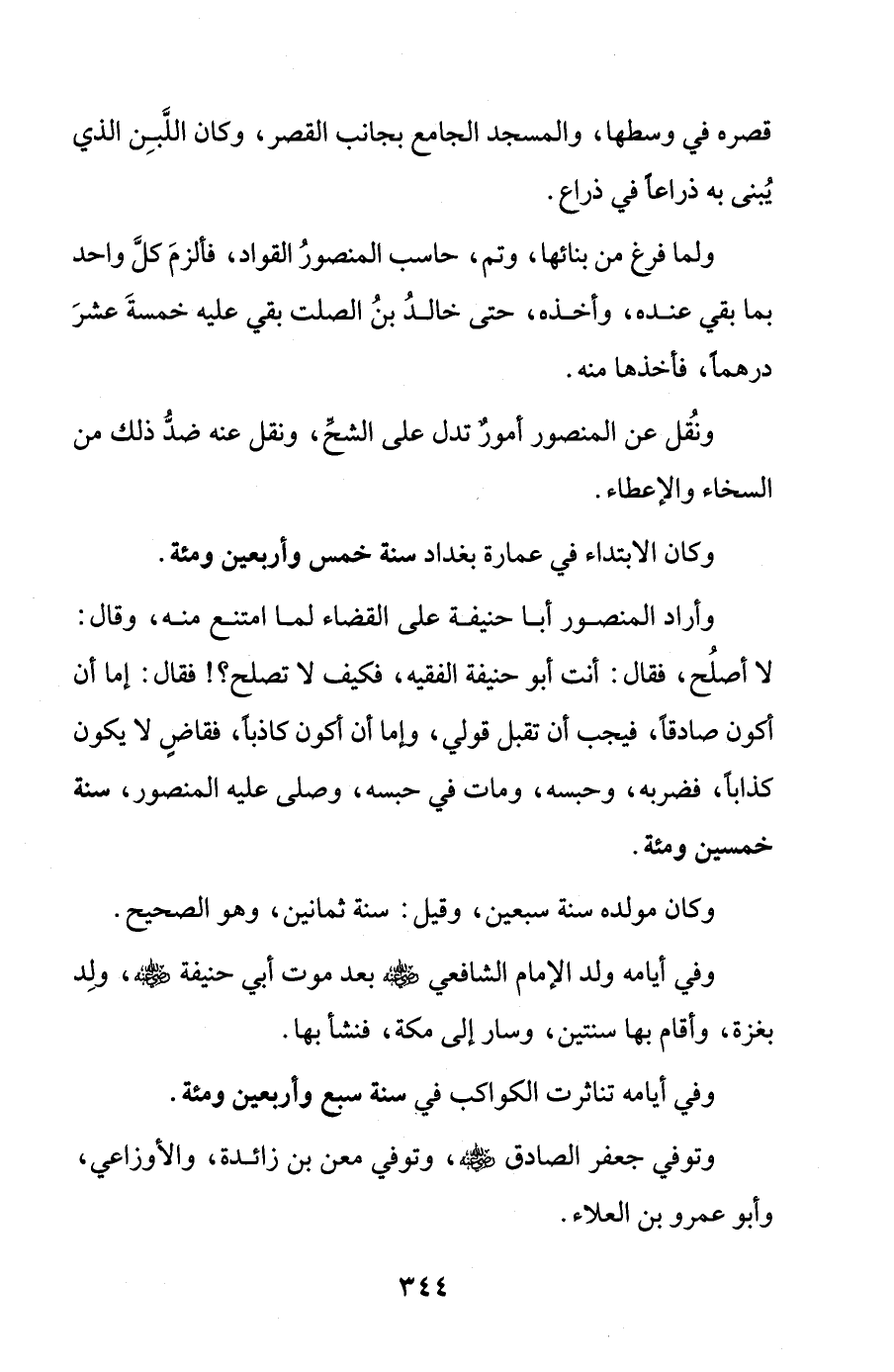 وأراد المنصور أبا حنيفة على القضاء لما امتنع منه، وقال: لا أصلُح، فقال: أنت أبو حنيفة الفقيه، فكيف لا تصلح؟ ! فقال: إما أن أكون صادقًا، فيجب أن تقبل قولي، وإما أن أكون كاذبًا، فقاضٍ لا يكون كذابًا، فضربه، وحبسه، ومات في حبسه، وصلى عليه المنصور، سنة خمسين ومئة.