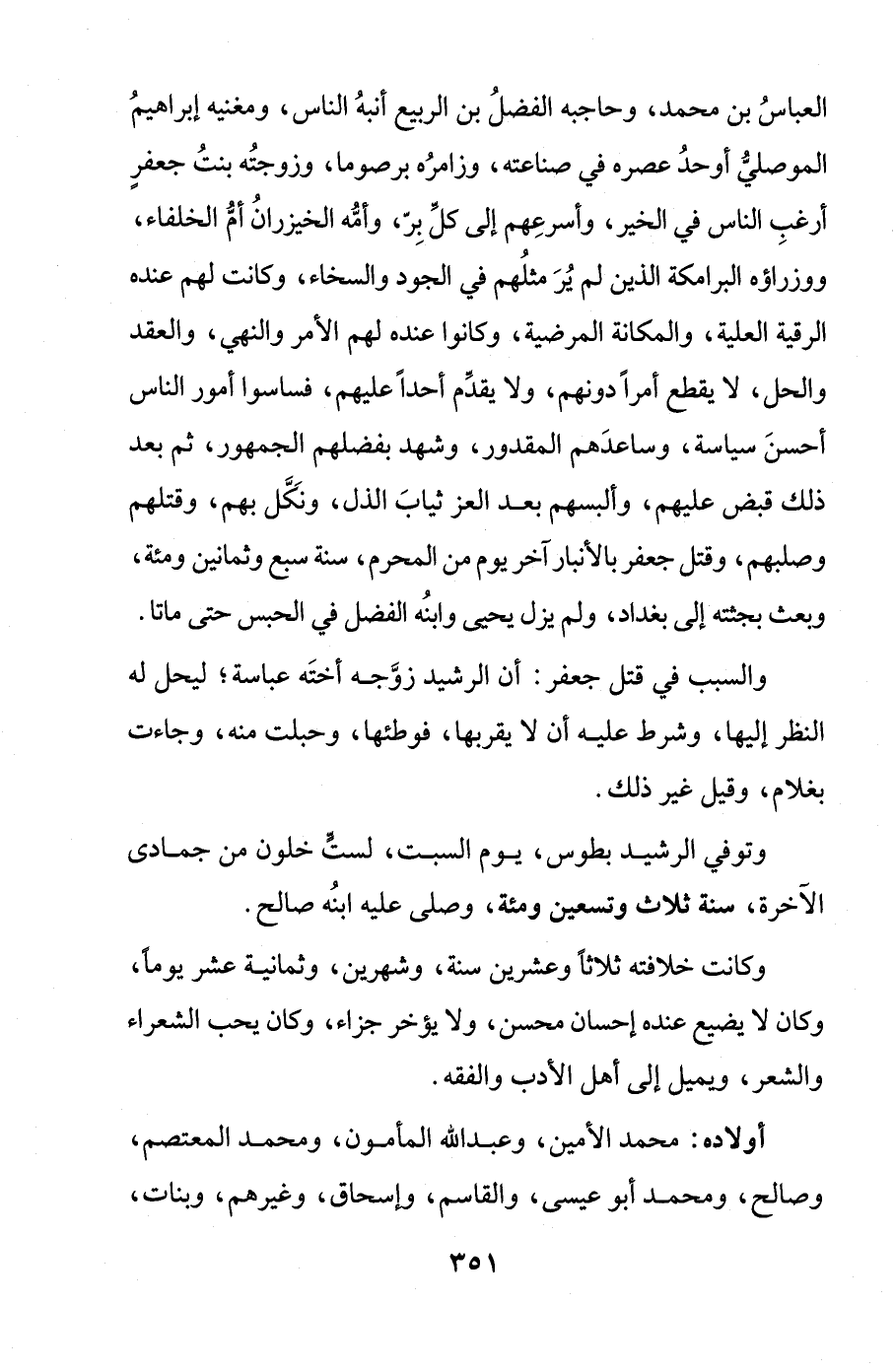 العباسُ بن محمد، وحاجبه الفضلُ بن الربيع أنبهُ الناس، ومغنيه إبراهيمُ الموصليُّ أوحدُ عصره في صناعته، وزامرُه برصوما، وزوجتُه بنتُ جعفرٍ أرغبِ الناس في الخير، وأسرعِهم إلى كلِّ بِرّ، وأمُّه الخيزرانُ أمُّ الخلفاء، ووزراؤه البرامكة الذين لم يُرَ مثلُهم في الجود والسخاء، وكانت لهم عنده الرقية العلية، والمكانة المرضية، وكانوا عنده لهم الأمر والنهي، والعقد والحل، لا يقطع أمرًا دونهم، ولا يقدِّم أحدًا عليهم، فساسوا أمور الناس أحسنَ سياسة، وساعدَهم المقدور، وشهد بفضلهم الجمهور، ثم بعد ذلك قبض عليهم، وألبسهم بعد العز ثيابَ الذل، ونكَّل بهم، وقتلهم وصلبهم، وقتل جعفر بالأنبار آخر يوم من المحرم، سنة سبع وثمانين ومئة، وبعث بجثته إلى بغداد، ولم يزل يحيى وابنُه الفضل في الحبس حتى ماتا.