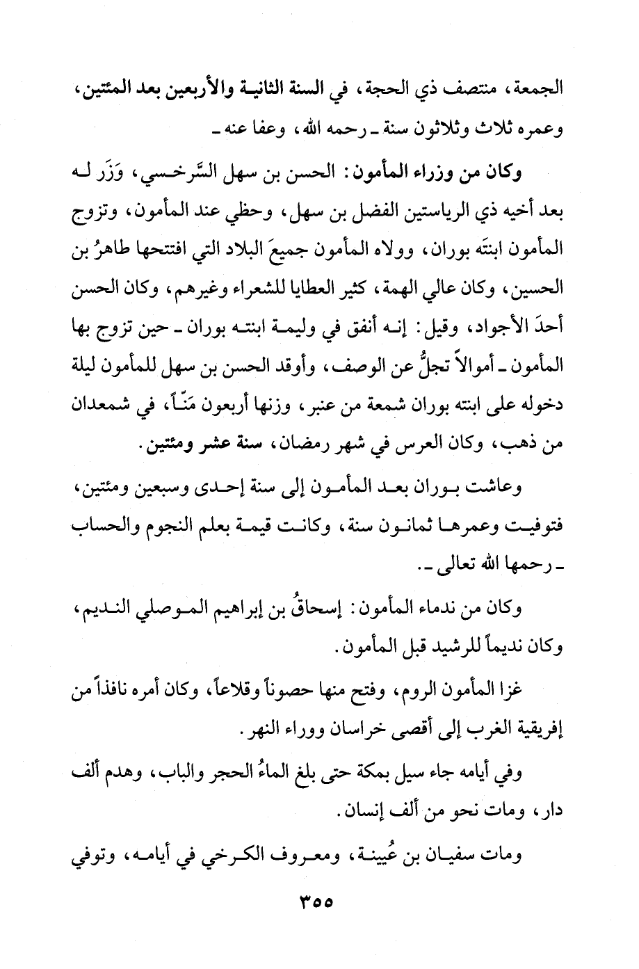 وكان من وزراء المأمون: الحسن بن سهل السَّرخسي، وَزَر له بعد أخيه ذي الرياستين الفضل بن سهل، وحظي عند المأمون، وتزوج المأمون ابنتَه بوران، وولاه المأمون جميعَ البلاد التي افتتحها طاهرُ بن الحسين، وكان عالي الهمة، كثير العطايا للشعراء وغيرهم، وكان الحسن أحدَ الأجواد، وقيل: إنه أنفق في وليمة ابنته بوران - حين تزوج بها المأمون - أموالًا تجلُّ عن الوصف، وأوقد الحسن بن سهل للمأمون ليلة دخوله على ابنته بوران شمعة من عنبر، وزنها أربعون مَنًّا، في شمعدان من ذهب، وكان العرس في شهر رمضان، سنة عشر ومئتين.