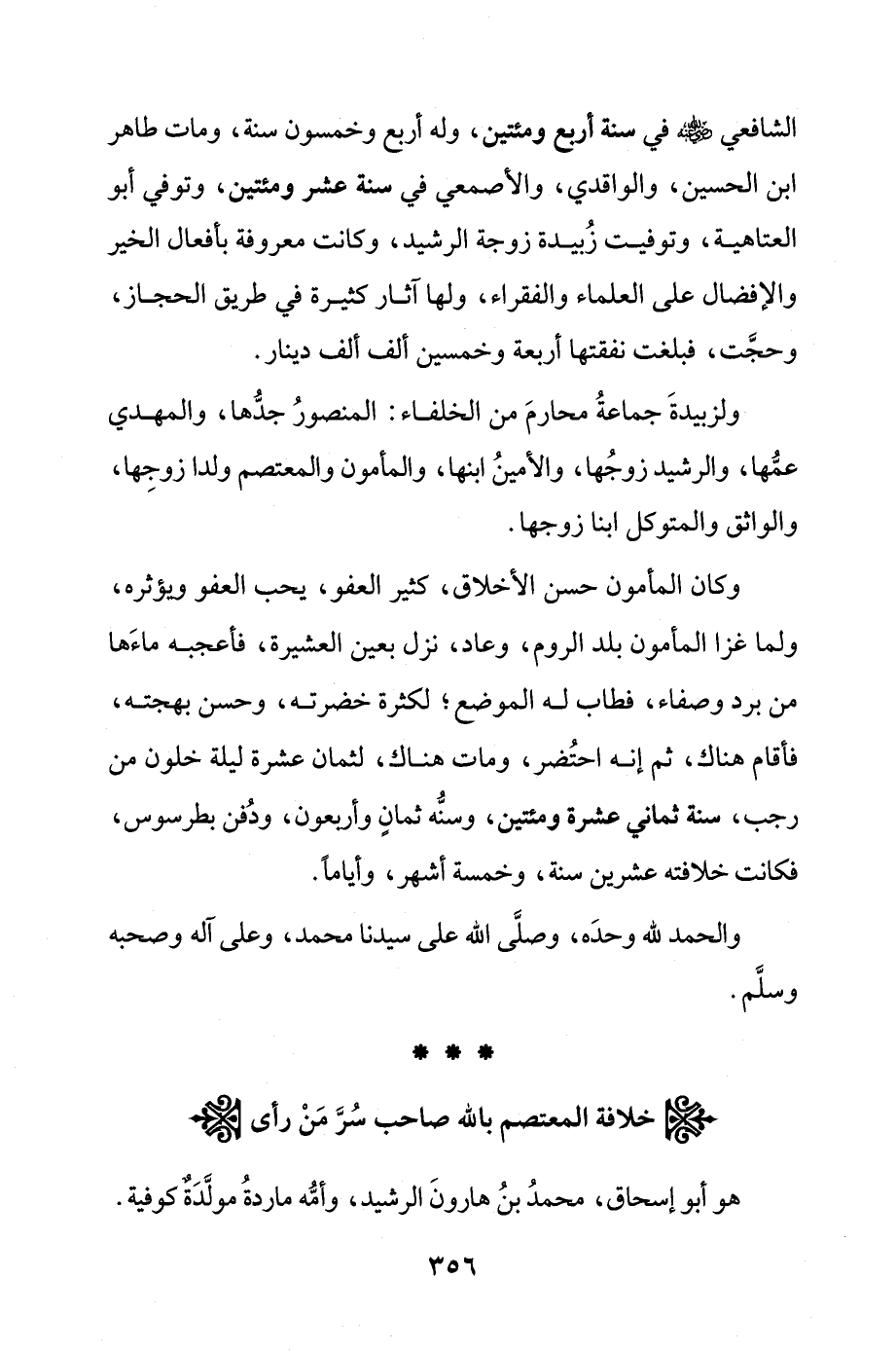 الشافعي - رضي الله عنه - في سنة أربع ومئتين، وله أربع وخمسون سنة، ومات طاهر ابن الحسين، والواقدي، والأصمعي في سنة عشر ومئتين، وتوفي أبو العتاهية، وتوفيت زُبيدة زوجة الرشيد، وكانت معروفة بأفعال الخير والإفضال على العلماء والفقراء، ولها آثار كثيرة في طريق الحجاز، وحجَّت، فبلغت نفقتها أربعة وخمسين ألف ألف دينار.