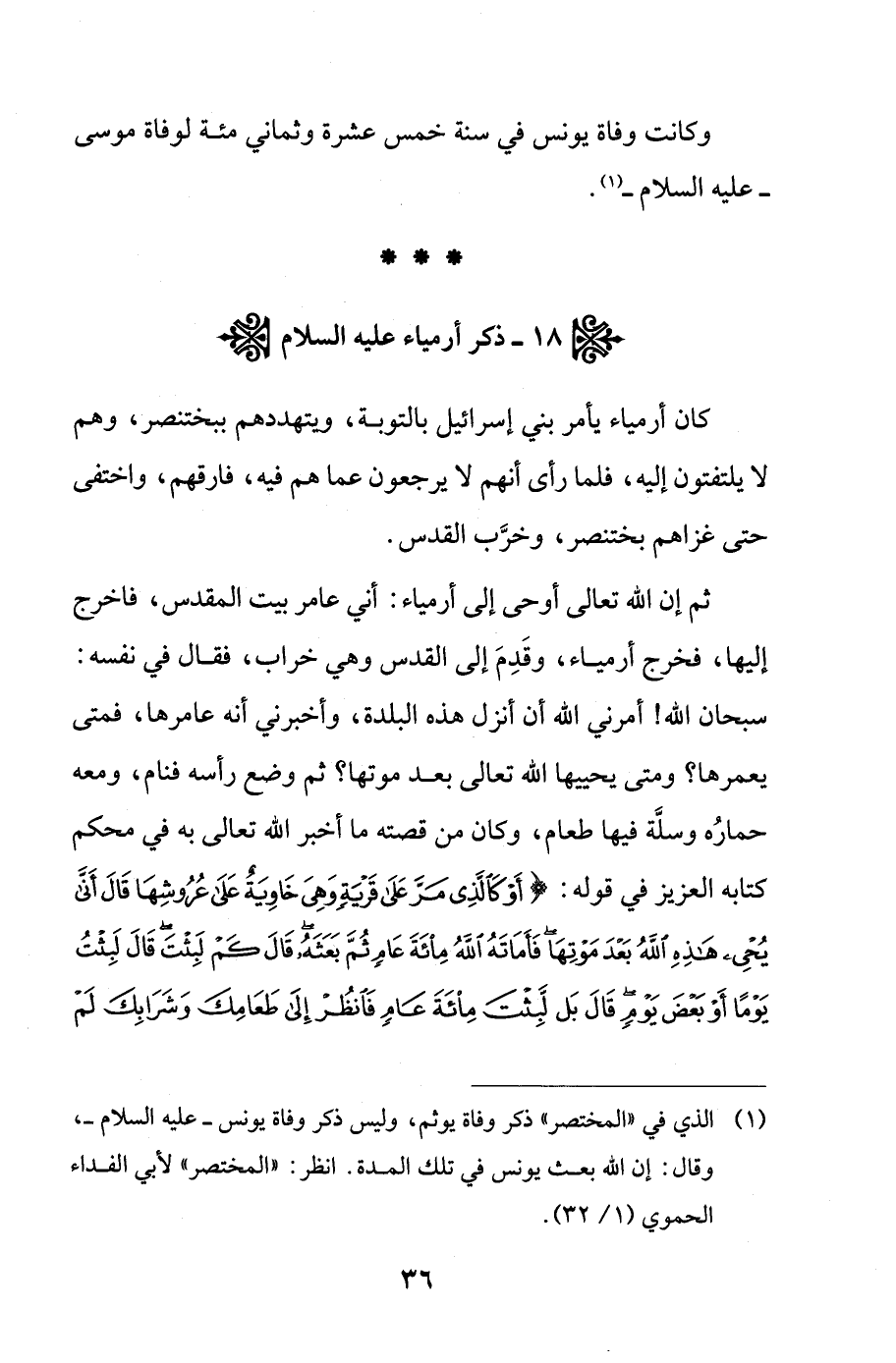 ثم إن الله تعالى أوحى إلى أرمياء: أني عامر بيت المقدس، فاخرج إليها، فخرج أرمياء، وقَدِمَ إلى القدس وهي خراب، فقال في نفسه: سبحان الله! أمرني الله أن أنزل هذه البلدة، وأخبرني أنه عامرها، فمتى يعمرها؛ ومتى يحييها الله تعالى بعد موتها؛ ثم وضع رأسه فنام، ومعه حمارُه وسلَّة فيها طعام، وكان من قصته ما أخبر الله تعالى به في محكم كتابه العزيز في قوله: {أَوْ كَالَّذِي مَرَّ عَلَى قَرْيَةٍ وَهِيَ خَاوِيَةٌ عَلَى عُرُوشِهَا قَالَ أَنَّى يُحْيِي هَذِهِ اللَّهُ بَعْدَ مَوْتِهَا فَأَمَاتَهُ اللَّهُ مِائَةَ عَامٍ ثُمَّ بَعَثَهُ قَالَ كَمْ لَبِثْتَ قَالَ لَبِثْتُ يَوْمًا أَوْ بَعْضَ يَوْمٍ قَالَ بَلْ لَبِثْتَ مِائَةَ عَامٍ فَانْظُرْ إِلَى طَعَامِكَ وَشَرَابِكَ لَمْ