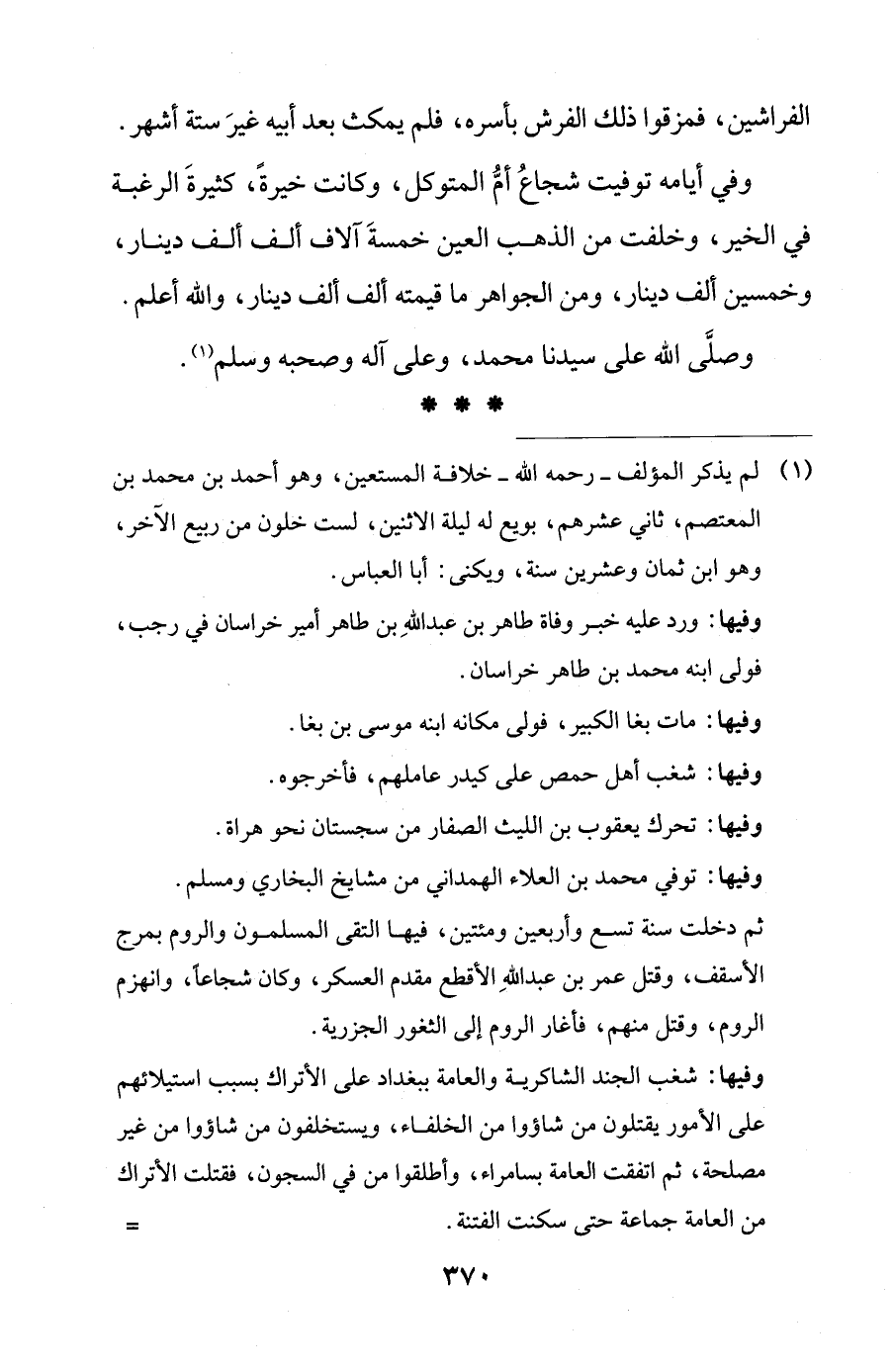 (¬1) لم يذكر المؤلف - رحمه الله - خلافة المستعين، وهو أحمد بن محمَّد بن المعتصم، ثاني عشرهم، بويع له ليلة الاثنين، لست خلون من ربيع الآخر، وهو ابن ثمان وعشرين سنة، ويكنى: أبا العباس.