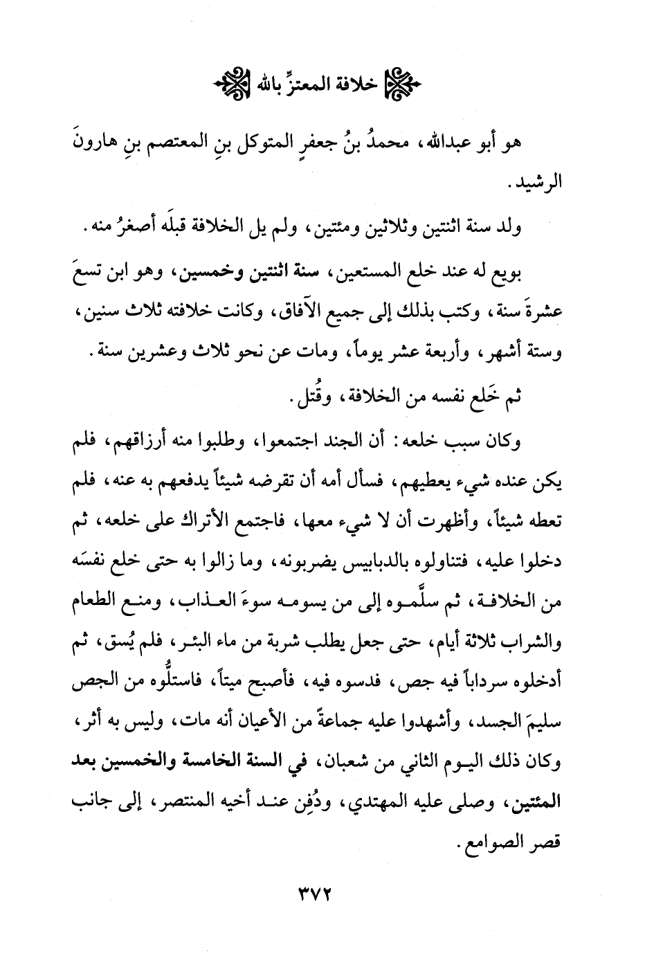 ولد سنة اثنتين وثلاثين ومئتين، ولم يل الخلافة قبلَه أصغرُ منه.