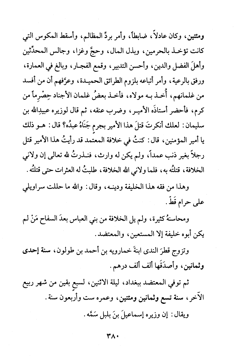 ومحاسنهُ كثيرة، ولم يل الخلافة من بني العباس بعدَ السفاح مَنْ لم يكن أبوه خليفة إلا المستعين، والمعتضد.