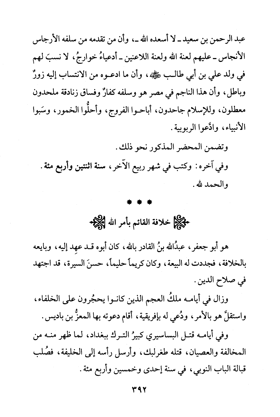 هو أبو جعفر، عبدُ الله بنُ القادر بالله، كان أبوه قد عهِد إليه، وبايعه بالخلافة، فجددت له البيعة، وكان كريما حليما، حسنَ السيرة، قد اجتهد في صلاح الدين.