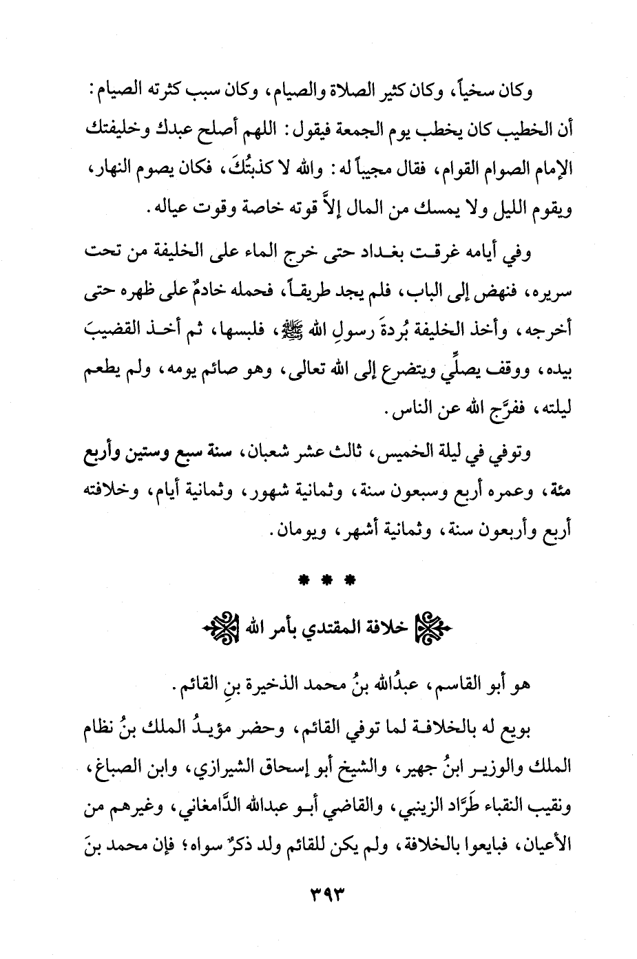 وفي أيامه غرقت بغداد حتى خرج الماء على الخليفة من تحت سريره، فنهض إلى الباب، فلم يجد طريقًا، فحمله خادم على ظهره حتى أخرجه، وأخذ الخليفة بُردةَ رسولِ الله - صلى الله عليه وسلم -، فلبسها، ثم أخذ القضيبَ بيده، ووقف يصلي ويتضرع إلى الله تعالى، وهو صائم يومه، ولم يطعم ليلته، ففرج الله عن الناس.