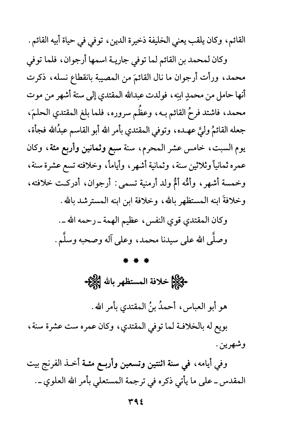 وفي أيامه، في سنة اثنتين وتسعين وأربع مئة أخذ الفرنج بيت المقدس - على ما يأتي ذكره في ترجمة المستعلي بأمر الله العلوي -.