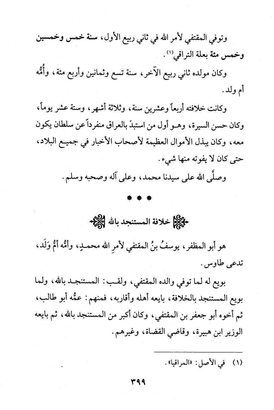 وتوفي المقتفي لأمر الله في ثاني ربيع الأول، سنة خمس وخمسين وخمس مئة بعلة التراقي (¬1).