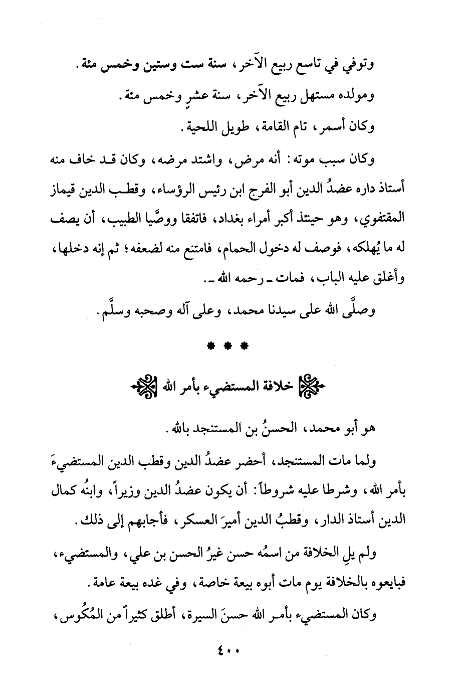 ولم يلِ الخلافة من اسمُه حسن غيرُ الحسن بن علي، والمستضيء، فبايعوه بالخلافة يوم مات أبوه بيعة خاصة، وفي غده بيعة عامة.