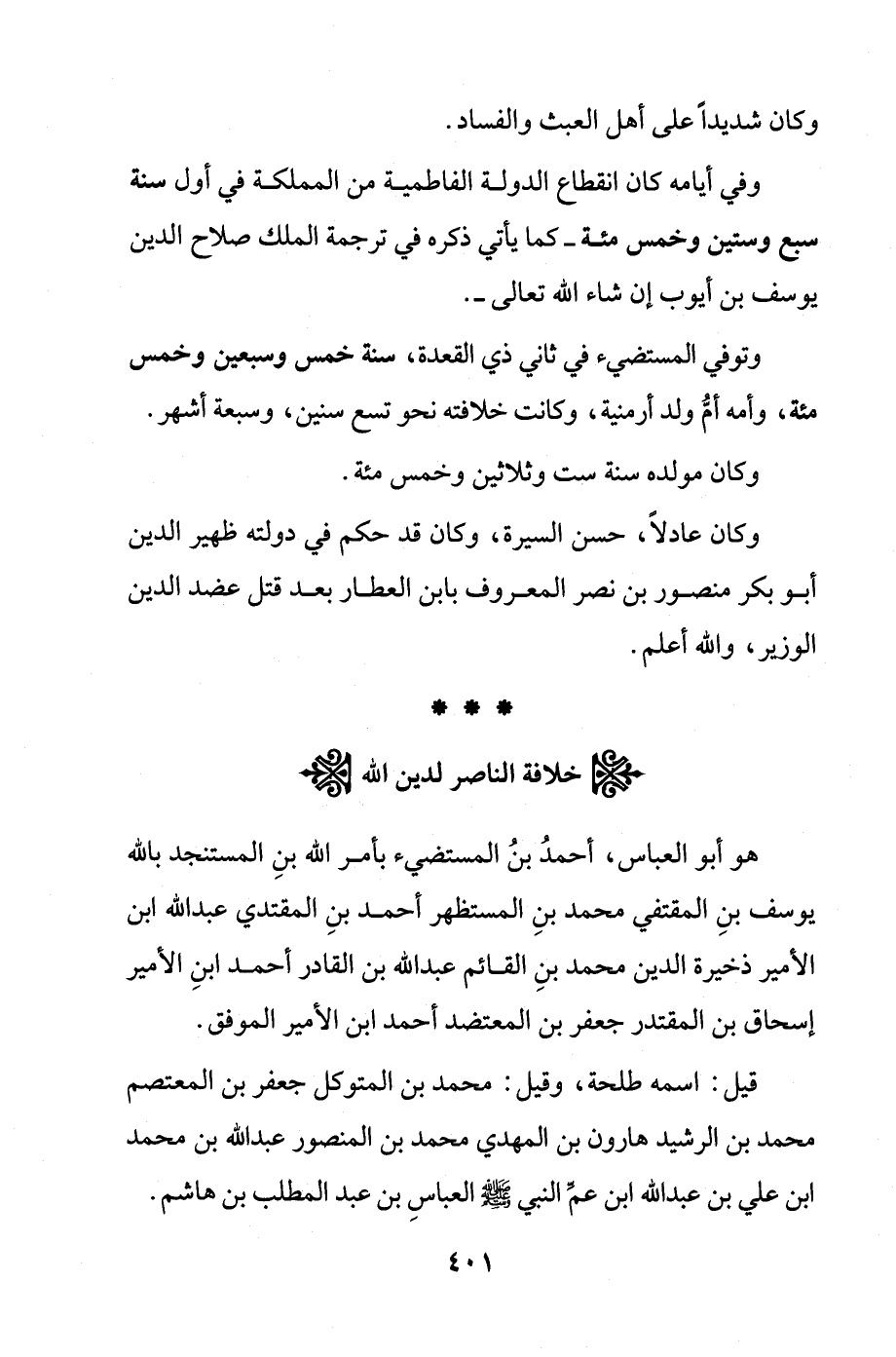 وتوفي المستضيء في ثاني ذي القعدة، سنة خمس وسبعين وخمس مئة، وأمه أمُّ ولد أرمنية، وكانت خلافته نحو تسع سنين، وسبعة أشهر.