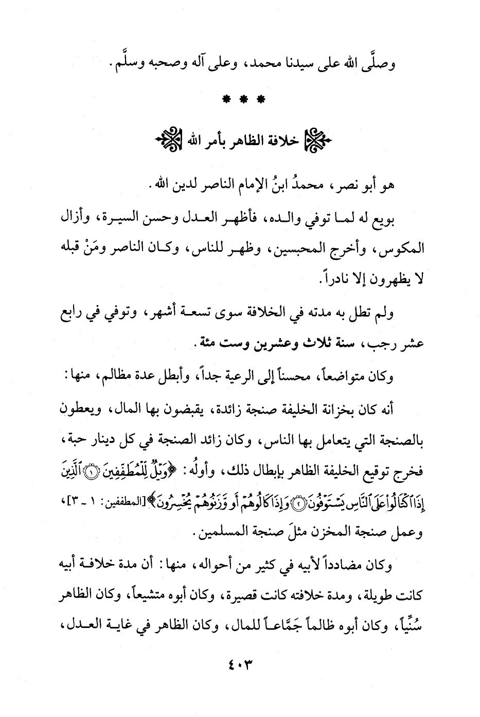 أنه كان بخزانة الخليفة صنجة زائدة، يقبضون بها المال، ويعطون بالصنجة التي يتعامل بها الناس، وكان زائد الصنجة في كل دينار حبَّة، فخرج توقيع الخليفة الظاهر بإبطال ذلك، وأولُى: {وَيْلٌ لِلْمُطَفِّفِينَ (1) الَّذِينَ إِذَا اكْتَالُوا عَلَى النَّاسِ يَسْتَوْفُونَ (2) وَإِذَا كَالُوهُمْ أَوْ وَزَنُوهُمْ يُخْسِرُونَ} [المطففين: 1 - 3] وعمل صنجة المخزن مثلَ صنجة المسلمين.
