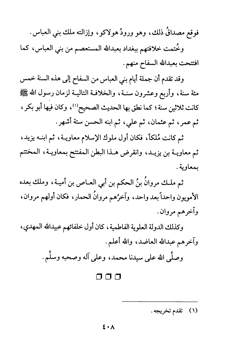 وقد تقدم أن جملة أيام بني العباس من السفاح إلى هذه السنة خمس مئة سنة، وأربع وعشرون سنة، والخلافة التالية لزمان رسول الله - صلى الله عليه وسلم - كانت ثلاثين سنة؛ كما نطق بها الحديث الصحيح (¬1)، وكان فيها أبو بكر، ثم عمر، ثم عثمان، ثم علي، ثم ابنه الحسن ستة أشهر.