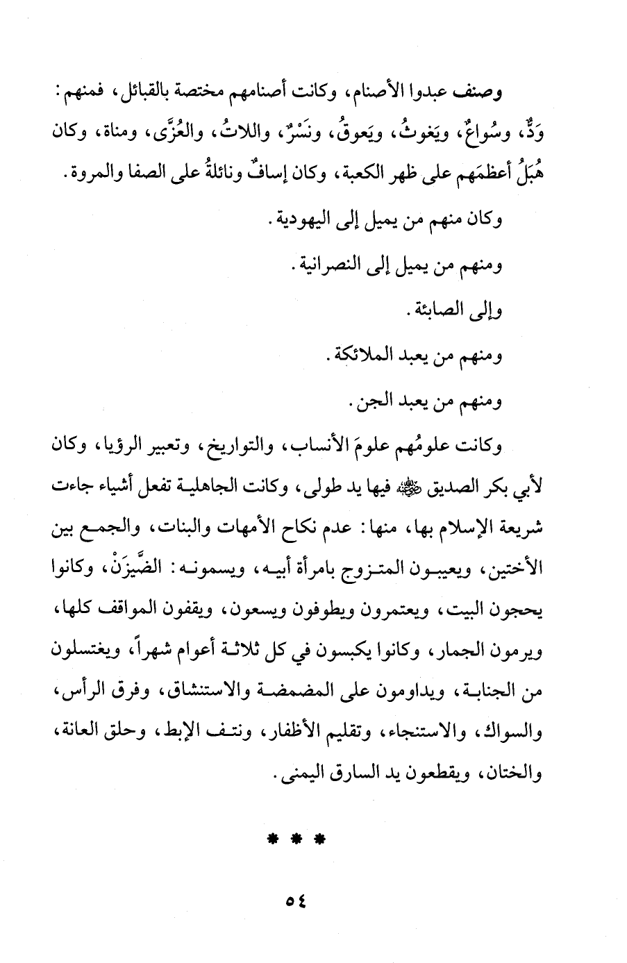 وكانت علومُهم علومَ الأنساب، والتواريخ، وتعبير الرؤيا، وكان لأبي بكر الصديق - رضي الله عنه - فيها يد طولى، وكانت الجاهلية تفعل أشياء جاءت شريعة الإسلام بها، منها: عدم نكاح الأمهات والبنات، والجمع بين الأختين، ويعيبون المتزوج بامرأة أبيه، ويسمونه: الضَّيزَنْ، وكانوا يحجون البيت، ويعتمرون ويطوفون ويسعون، ويقفون المواقف كلها، ويرمون الجمار، وكانوا يكبسون في كل ثلاثة أعوام شهراً، ويغتسلون من الجنابة، ويداومون على المضمضة والاستنشاق، وفرق الرأس، والسواك، والاستنجاء، وتقليم الأظفار، ونتف الإبط، وحلق العانة، والختان، ويقطعون يد السارق اليمنى.