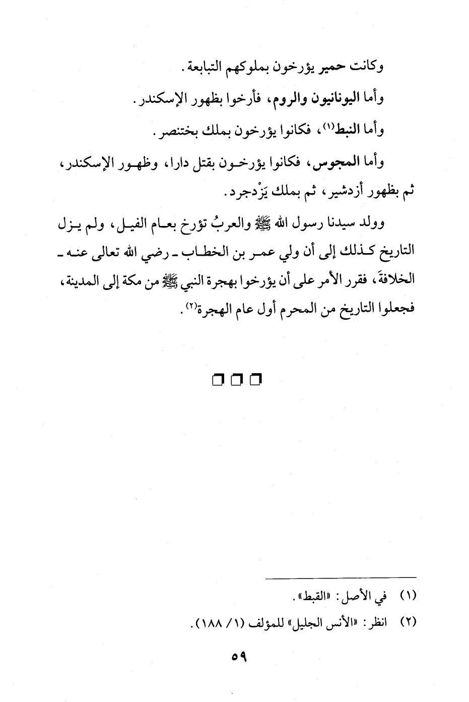 وولد سيدنا رسول الله - صلى الله عليه وسلم - والعربُ تؤرخ بعام الفيل، ولم يزل التاريخ كذلك إلى أن ولي عمر بن الخطاب - رضي الله تعالى عنه - الخلافةَ، فقرر الأمر على أن يؤرخوا بهجرة النبي - صلى الله عليه وسلم - من مكة إلى المدينة، فجعلوا التاريخ من المحرم أول عام الهجرة (¬2).
