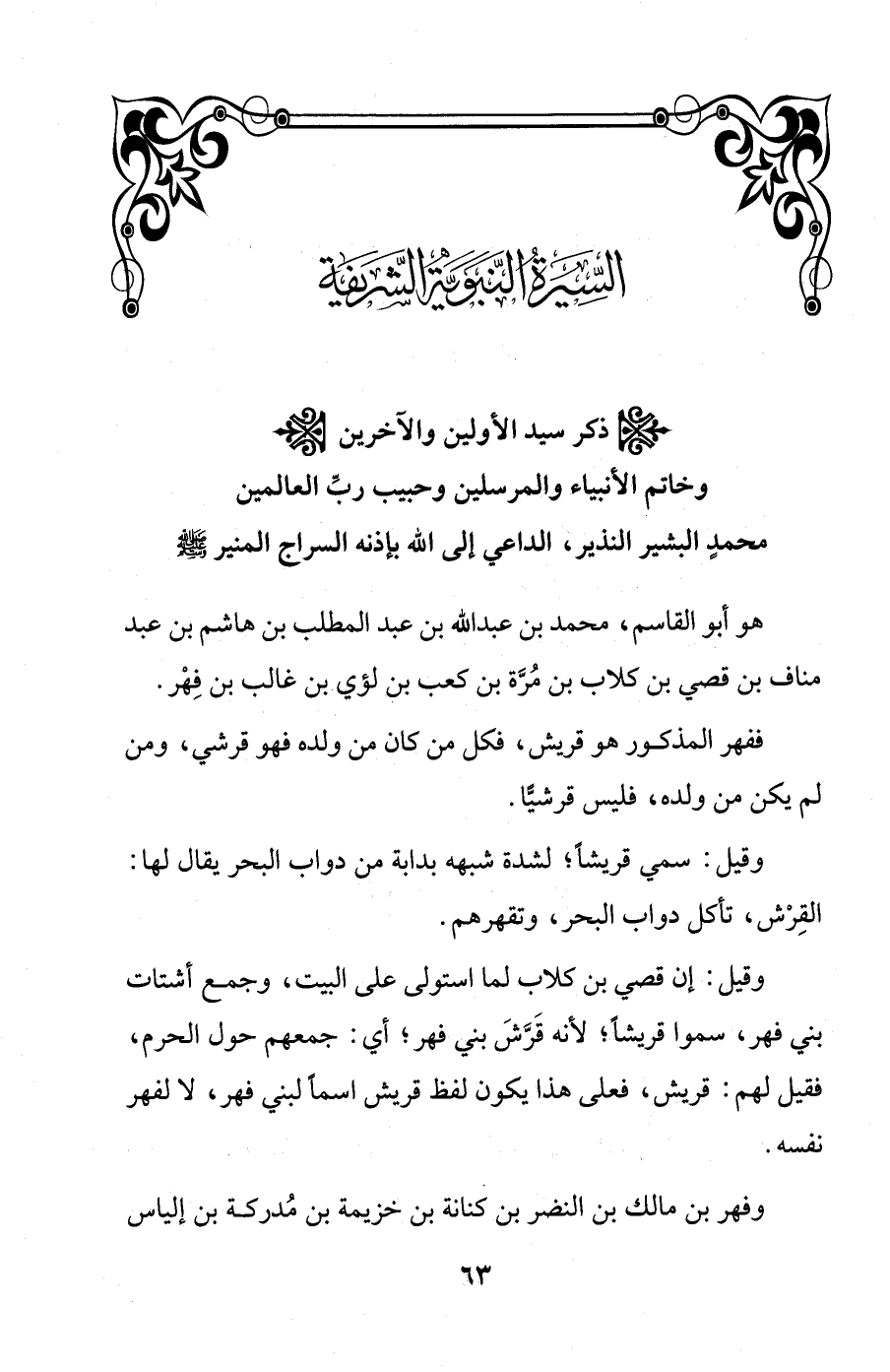هو أبو القاسم، محمد بن عبد الله بن عبد المطلب بن هاشم بن عبد مناف بن قصي بن كلاب بن مُرَّة بن كعب ببن لؤي بن غالب بن فِهْر.