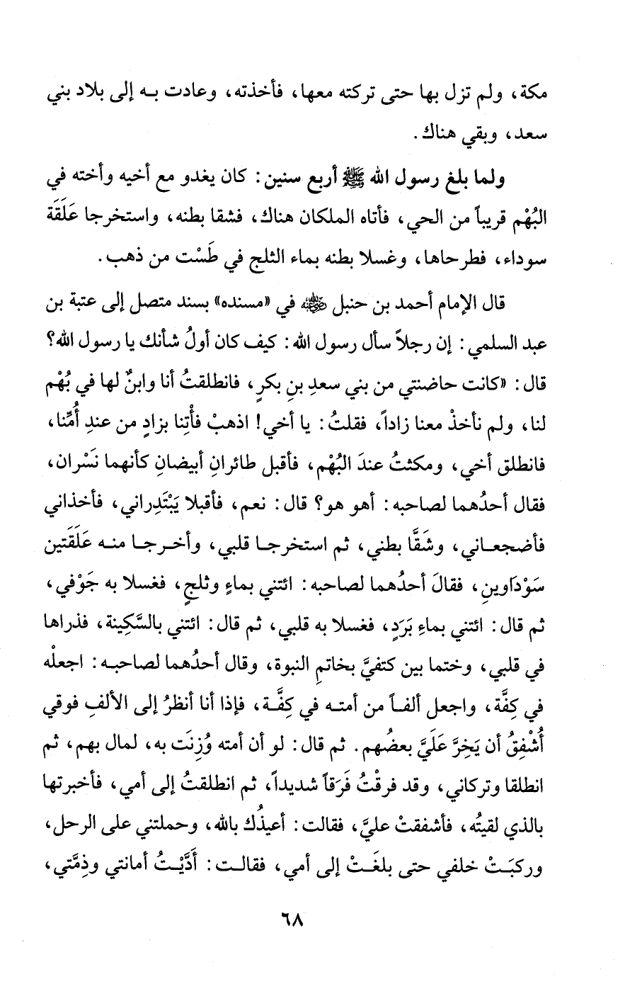 قال الإمام أحمد بن حنبل - رضي الله عنه - في "مسنده" بسند متصل إلى عتبة بن عبد السلمي: إن رجلًا سأل رسول الله: كيف كان أولُ شأنك يا رسول الله؟ قال: "كانت حاضنتي من بني سعدِ بنِ بكر، فانطلقتُ أنا وابنٌ لها في بُهْم لنا، ولم نأخذْ معنا زادًا، فقلتُ: يا أخي! اذهبْ فأْتِنا بزادٍ من عندِ أُمِّنا، فانطلق أخي، ومكثتُ عندَ البُهْم، فأقبل طائرانِ أبيضانِ كأنهما نَسْران، فقال أحدُهما لصاحبه: أهو هو؟ قال: نعم، فأقبلا يَبْتَدِراني، فأخذاني فأضجعاني، وشَقَّا بطني، ثم استخرجا قلبي، وأخرجا منه عَلَقَتين سَوْدَاوينِ، فقالَ أحدُهما لصاحبه: ائتني بماءٍ وثلجٍ، فغسلا به جَوْفي، ثم قال: ائتني بماءِ بَرَدٍ، فغسلا به قلبي، ثم قال: ائتني بالسَّكِينة، فذراها في قلبي، وختما بين كتفيَّ بخاتمِ النبوة، وقال أحدُهما لصاحبه: اجعلْه في كِفَّة، واجعل الفًا من أمته في كِفَّة، فإذا أنا أنظرُ إلى الألفِ فوقي أُشْفِقُ أن يَخِرَّ عَلَيَّ بعضُهم. ثم قال: لو أن أمته وُزِنتَ به، لمال بهم، ثم انطلقا وتركاني، وقد فرقْتُ فَرَقا شديدًا، ثم انطلقتُ إلى أمي، فأخبرتها بالذي لقيتُه، فأشفقتْ عليَّ، فقالت: أعيذُك بالله، وحملتني على الرحل، وركبَتْ خلفي حتى بلغَتْ إلى أمي، فقالت: أَدَّيْتُ أمانتي وذِمَّتي،