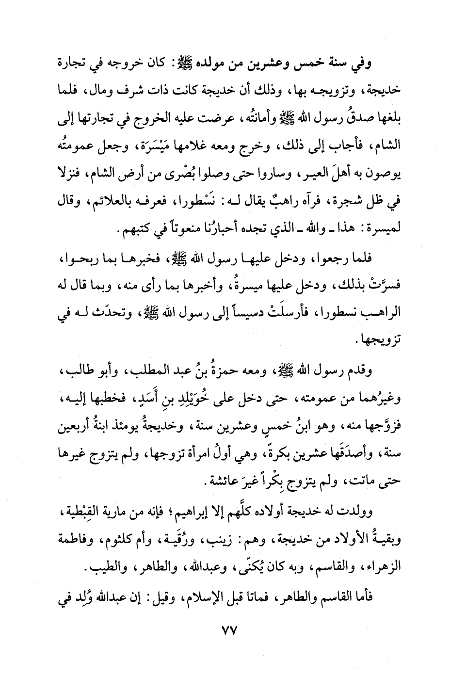 وفي سنة خمس وعشرين من مولده - صلى الله عليه وسلم -: كان خروجه في تجارة خديجة، وتزويجه بها، وذلك أن خديجة كانت ذات شرف ومال، فلما بلغها صدقُ رسول الله - صلى الله عليه وسلم - وأمانتُه، عرضت عليه الخروج في تجارتها إلى الشام، فأجاب إلى ذلك، وخرج ومعه غلامها مَيْسَرَة، وجعل عمومتُه يوصون به أهلَ العير، وساروا حتى وصلوا بُصْرى من أرض الشام، فنزلا في ظل شجرة، فرآه راهبٌ يقال له: نَسْطورا، فعرفه بالعلائم، وقال لميسرة: هذا - والله - الذي تجده أحبارُنا منعوتًا في كتبهم.