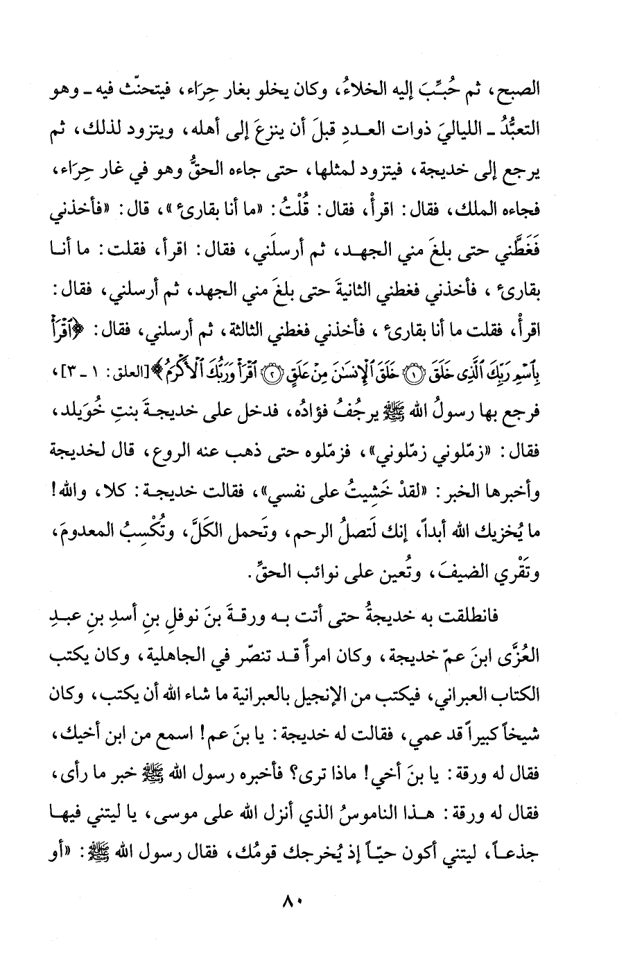 الصبح، ثم حُبِّبَ إليه الخلاءُ، وكان يخلو بغار حِرَاء، فيتحنّث فيه - وهو التعبُّدُ - اللياليَ ذوات العددِ قبلَ أن ينزعَ إلى أهله، ويتزود لذلك، ثم يرجع إلى خديجة، فيتزود لمثلها، حتى جاءه الحقُّ وهو في غار حِرَاء، فجاءه الملك، فقال: اقرأْ، فقال: قُلْتُ: "ما أنا بقارئ"، قال: "فأخذني فَغَطَّني حتى بلغَ مني الجهد، ثم أرسلَني، فقال: اقرأ، فقلت: ما أنا بقارئ، فأخذني فغطني الثانيةَ حتى بلغَ مني الجهد، ثم أرسلني، فقال: اقرأْ، فقلت ما أنا بقارى"، فأخذني فغطني الثالثة، ثم أرسلني، فقال: {اقْرَأْ بِاسْمِ رَبِّكَ الَّذِي خَلَقَ (1) خَلَقَ الْإِنْسَانَ مِنْ عَلَقٍ (2) اقْرَأْ وَرَبُّكَ الْأَكْرَمُ} [العلق: 1 - 3]، فرجع بها رسولُ الله - صلى الله عليه وسلم - يرجُفُ فؤادُه، فدخل على خديجةَ بنتِ خُوَيلد، فقال: "زمّلوني زمّلوني"، فزمّلوه حتى ذهب عنه الروع، قال لخديجة وأخبرها الخبر: "لقدْ خَشِيتُ على نفسي"، فقالت خديجة: كلا، والله! ما يُخزيك الله أبدًا، إنك لَتصلُ الرحم، وتَحمل الكَلَّ، وتُكْسِبُ المعدومَ، وتَقْري الضيفَ، وتُعين على نوائب الحقِّ.