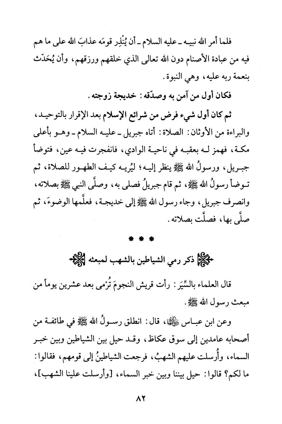 ثم كان أول شيء فرض من شرائع الإسلام بعد الإقرار بالتوحيد، والبراءة من الأوثان: الصلاة: أتاه جبريل - عليه السلام - وهو بأعلى مكة، فهمز له بعقبه في ناحية الوادي، فانفجرت فيه عين، فتوضأ جبريل، ورسولُ الله - صلى الله عليه وسلم - ينظر إليه؛ ليُريه كيف الطهور للصلاة، ثم توضأ رسولُ الله - صلى الله عليه وسلم -، ثم قام جبريلُ فصلى به، وصلَّى النبي - صلى الله عليه وسلم - بصلاته، وانصرف جبريل، وجاء رسول الله - صلى الله عليه وسلم - إلى خديجة، فعلَّمها الوضوءَ، ثم صلَّى بها، فصلت بصلاته.