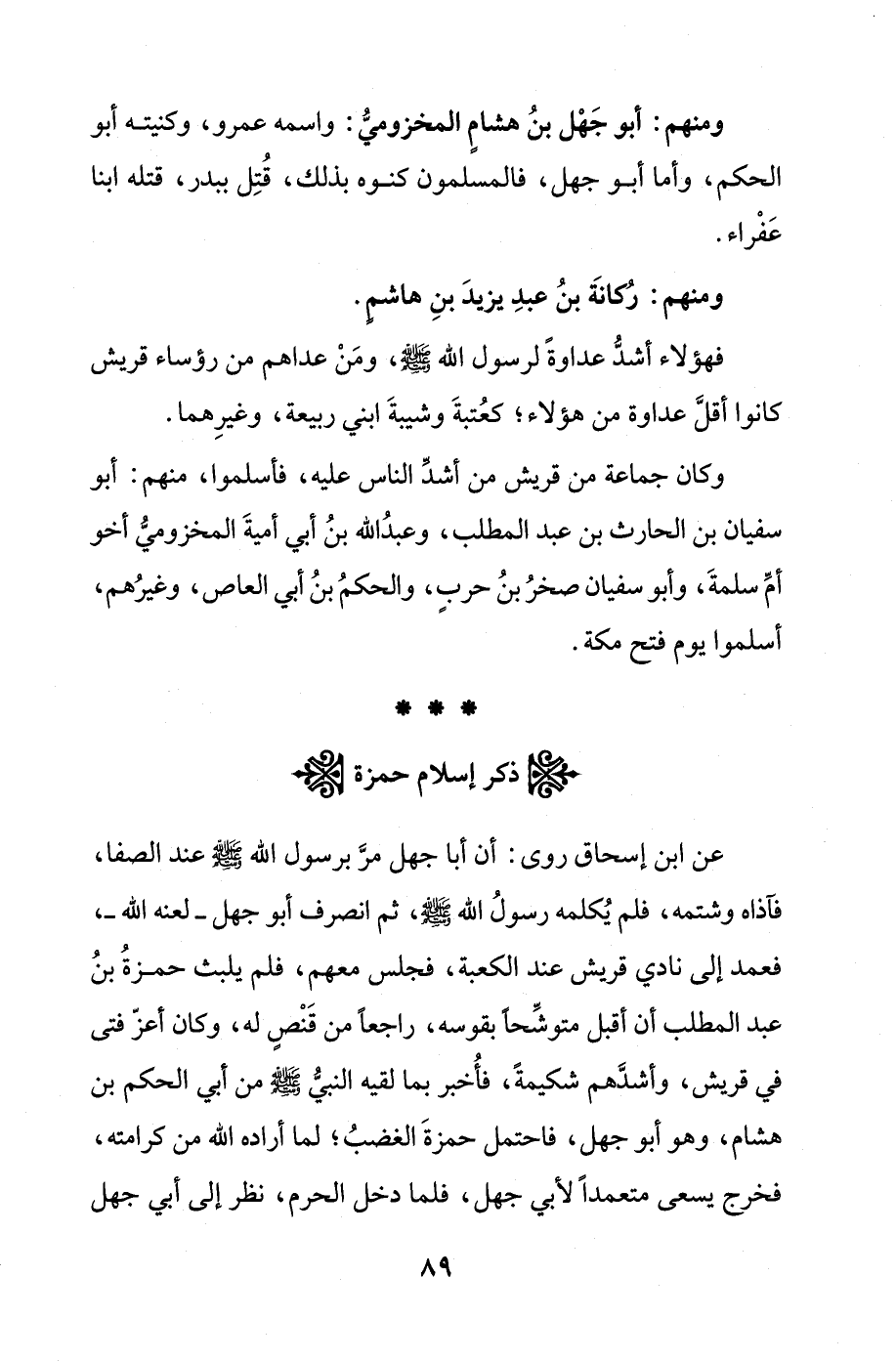 عن ابن إسحاق روى: أن أبا جهل مرَّ برسول الله - صلى الله عليه وسلم - عند الصفا، فآذاه وشتمه، فلم يُكلمه رسولُ الله - صلى الله عليه وسلم -، ثم انصرف أبو جهل - لعنه الله -، فعمد إلى نادي قريش عند الكعبة، فجلس معهم، فلم يلبث حمزةُ بنُ عبد المطلب أن أقبل متوشِّحًا بقوسه، راجعًا من قَنْصٍ له، وكان أعزّ فتى في قريش، وأشدَّهم شكيمةً، فأخبر بما لقيه النبيُّ - صلى الله عليه وسلم - من أبي الحكم بن هشام، وهو أبو جهل، فاحتمل حمزةَ الغضبُ؛ لما أراده الله من كرامته، فخرج يسعى متعمدًا لأبي جهل، فلما دخل الحرم، نظر إلى أبي جهل